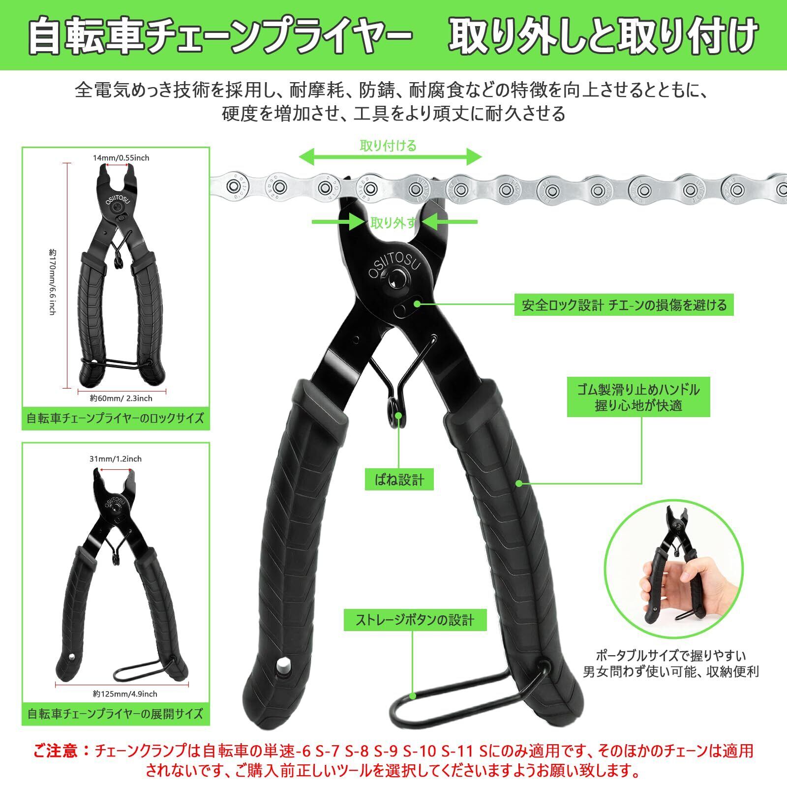 【自転車チェーンプライヤー 取り外しと取り付け】6速~11速対応、良質な鋼材を使用し、一体プレス成形加工及び熱処理を施し、高い強度と優れた耐久性を両立します。双方向の円弧浅口設計に加え、安全ロック機能を搭載しており、作業中のスリップを効果的に防止します。グリップ部分には滑り止めゴムカバーを装着し、持ちやさを向上させております。底部には固定クリップが付属しており、持ち運びや保管にも便利です。