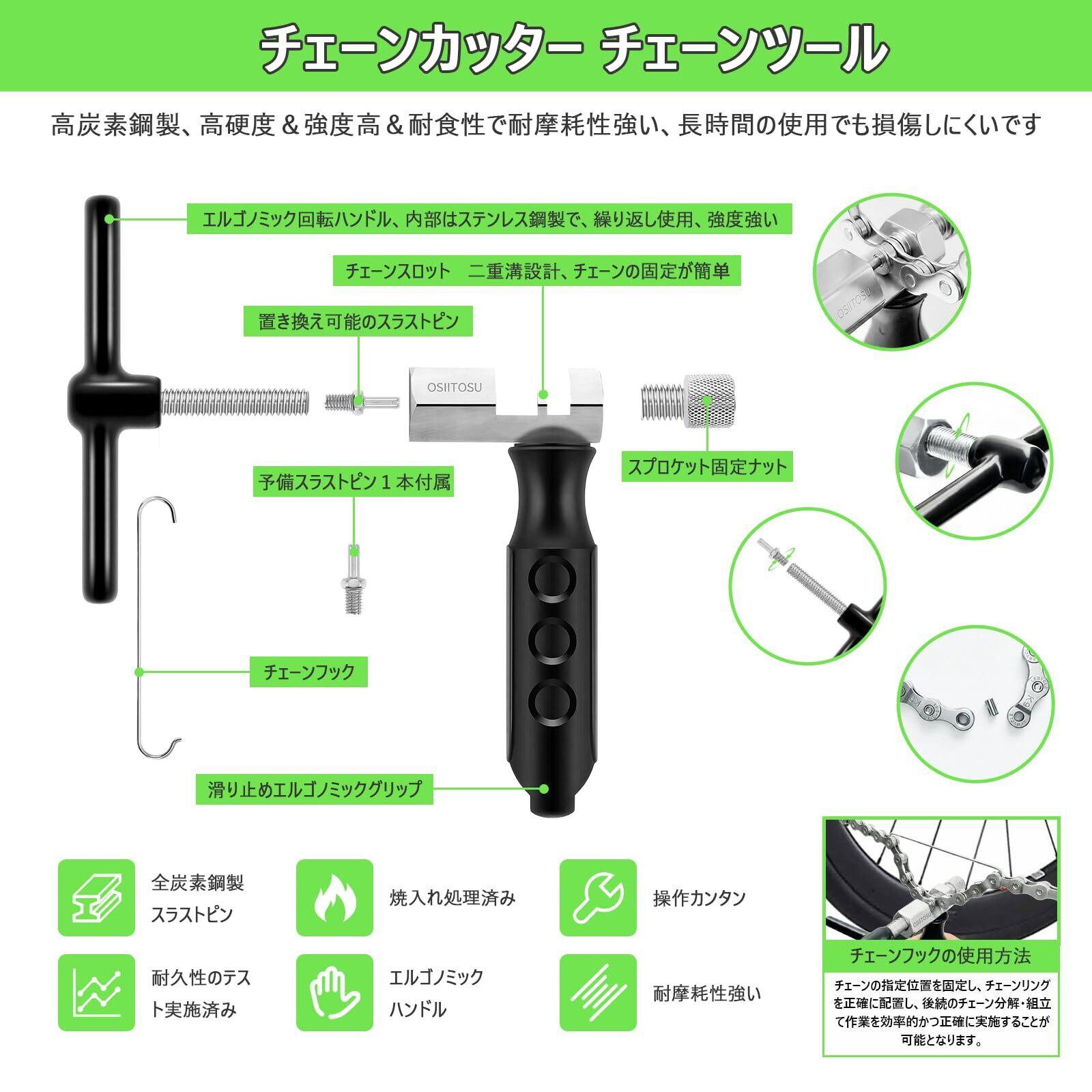 【チェーンカッター】OSIITOSU 自転車チェーンカッターは高炭素鋼製で、高硬度・高強度・耐食性・耐摩耗性に優れ、長時間使用しても損傷しにくいです。人間工学に基づいた回転ハンドルは内部がステンレス鋼製で、繰り返し使用に耐えます。可動式ハンドルのデザインにより、チェーン切断時の力加減が把握しやすくなっています。ハンドルヘッドはスクリュー式設計で本体に密着して組み込まれるため、脱落しにくい構造です。さらに、圧入式スラストピンは芯の精度が高く、位置ずれなし・誤差ゼロで、繰り返し使用できる耐久性と十分な強度を備えています。(予備スラストピン 1 本を付属しているため、長期間の使用が可能で、コストパフォーマンスに優れています。)また、グリプ部分には滑り止めゴムを採用しており、自転車チェーンの取り付け作業も安全かつ確実に行えます。繰り返し使える本格派の自転車メンテナンス工具です。