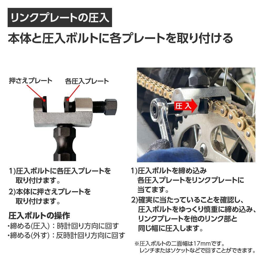 ※リンクプレートを圧入し過ぎると、チェーンの動きを悪くし、また圧入が足りないとカシメ不足になりますので、他のリンク部と同じ幅に圧入してください。