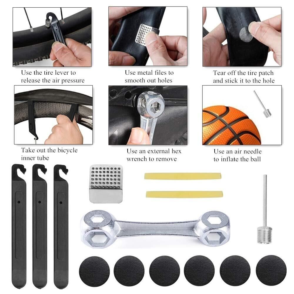 【修理キット付属品】この自転車修理工具には、ミニチュア自転車ポンプ、マスターリンクプライヤー、自転車クランクプーラー/プラー+ 16mmレンチ、自転車バッグと16-in-1多機能修理工具、ボーンヘックスレンチが含まれています。 、6つのラバーフリータイヤパッチ、3つの自転車タイヤクローバー、メタルファイル、スポーツインフレータブルピン、2つのバルブラバーリング