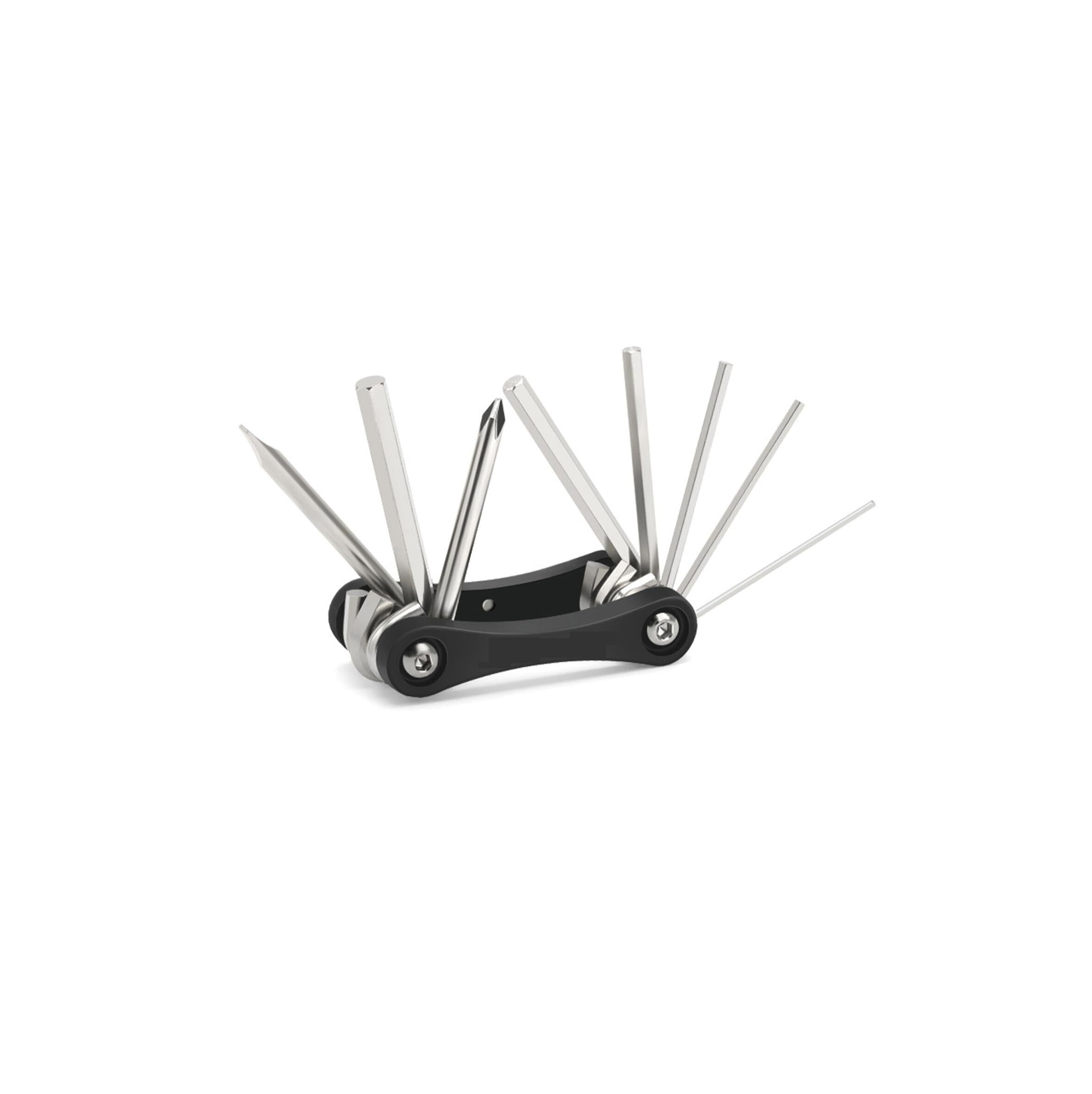バイクの修理に最適な8in1六角スパナのセット。このセットには、2mm/2.5mm/3mm/4mm/5mm/6mmの六角レンチ、プラム・ヘッド・ドライバー用の#2ドライバー・ビット、さまざまなネジやボルトに対応する0.8 x 5.0ドライバー・パーツが含まれている。ドライバーは長期間の使用に耐えるよう、硬くて錆びにくい高品質のスチール製。折りたたみ式のコンパクト設計で、収納時の全長は約72mm、重量はわずか120gと、ロードバイクや自転車用の携帯工具として便利。場所を取らず、持ち運びや走行中の使用も簡単だ。スムーズなネジ締めと調整可能なスパナ緩めにより、スムーズなバイクメンテナンスを実現。ロードバイクや自転車のメンテナンスに欠かせないマルチツールとして、ツールキットの必需品だ。