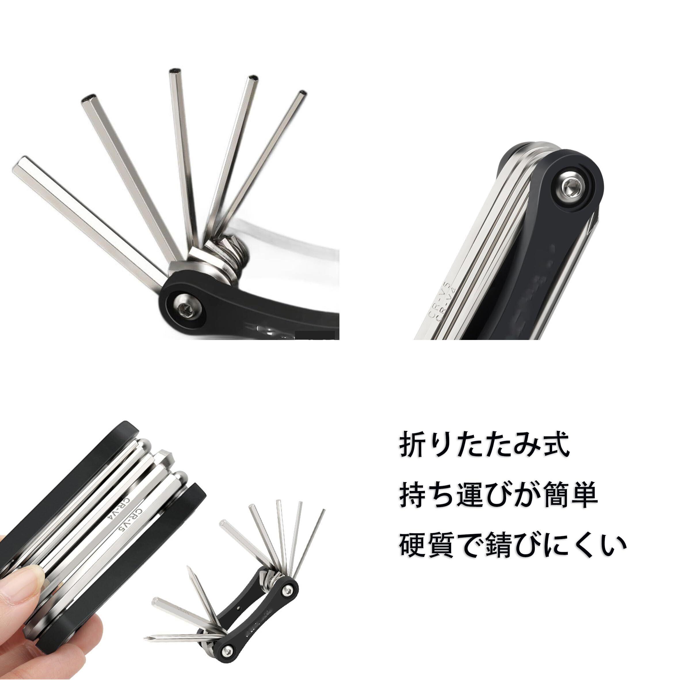 2.高硬度設計自転車工具、高品質の鋼製、耐久性。折りたたみ式で超コンパクト、収納時わずか72mm。ロードバイク携帯工具として、ポケットやバッグに収納でき、外出先でのメンテナンスに最適です。