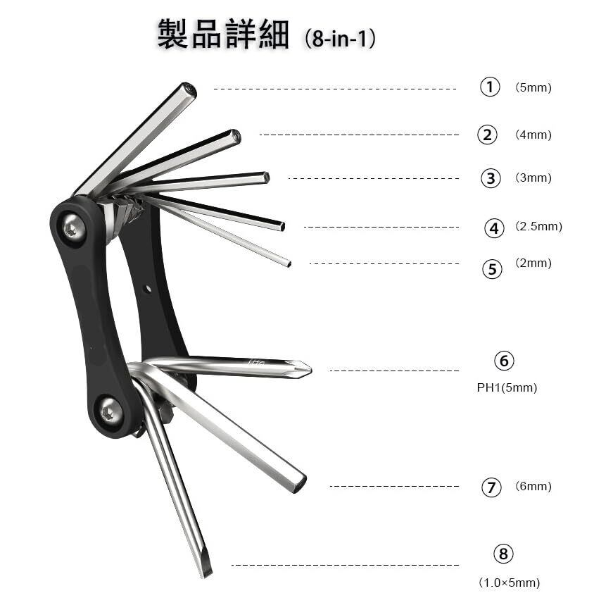 1.自転車メンテナンス用8in1六角スパナセット、2mm/2.5mm/3mm/4mm/5mm/6mmの六角ビット、プラムビット(№2)、ドライバーパーツ(0.8x5.0)が入った便利な工具です。ロードバイクや自転車の日常メンテナンスに便利なコンパクトな工具セットです。