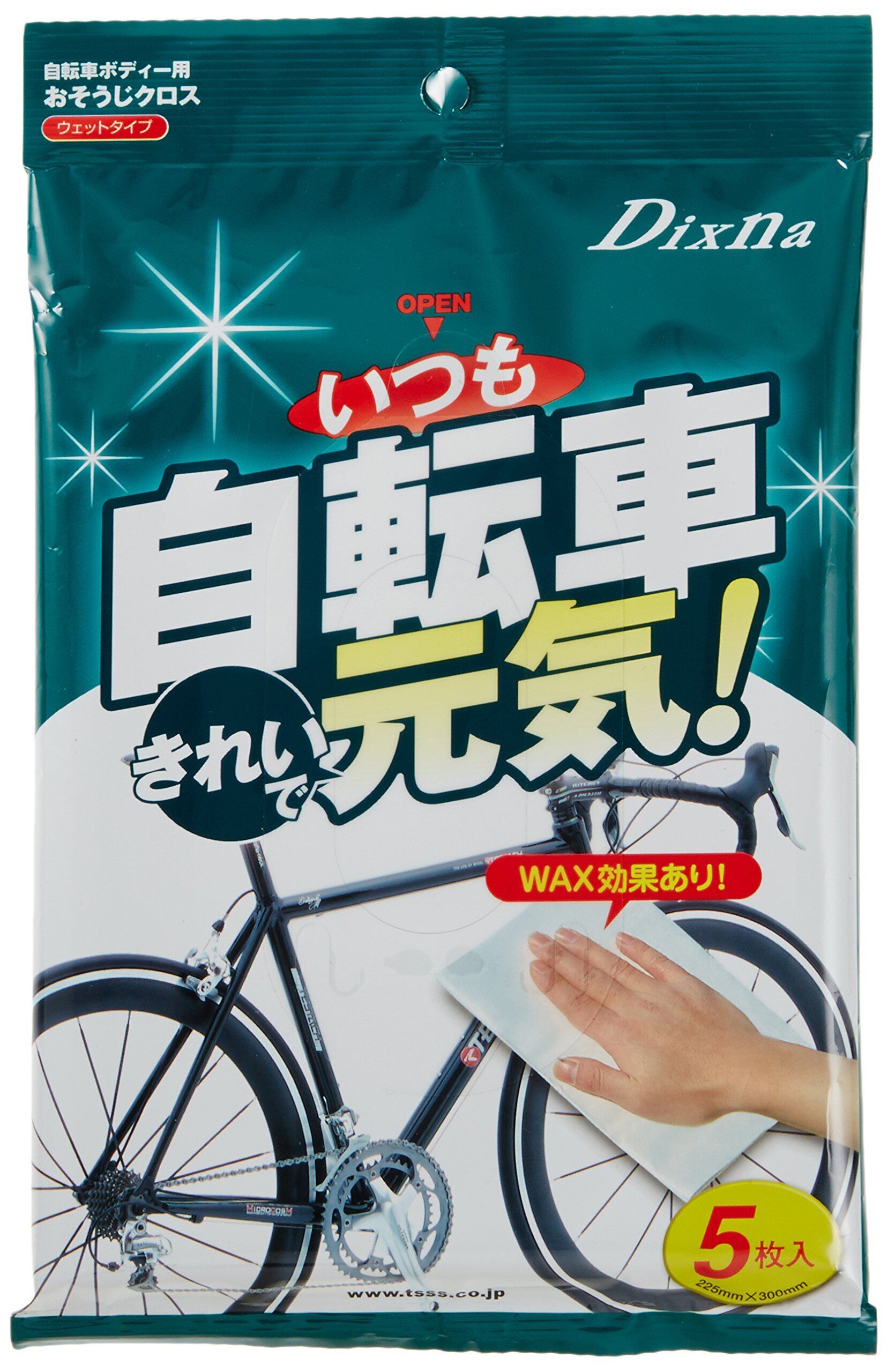 自転車のお手入れはどうしたら良いの?? メンテナンスの雑誌は出てるけど、簡単なお手入れ方法がわからない。 高級自転車だけど家には保管出来ないから、雨ざらし。など、皆さん色々悩んでいませんか?? そんなときこのウエットティシュタイプの自転車用クリーナーで『サッと拭けば』長く楽しく自転車と付きあえます。 自転車を綺麗に保つことは見た目をよくし、ヒビ割れなどのトラブルを早期に発見できる効果もあり、重要なメンテナンスのひとつです。 砂埃や汚れがひどい場合などに使用すると、傷が付く場合がありますので、ご注意ください。 愛車の健康状態をチェックするには、まずは日常の拭き掃除から。 ■用途:自転車本体の汚れ落とし、撥水 ■素材:レーヨン系不織布 ■成分:洗浄剤撥水剤 ■サイズ:225mm×300mm ■枚数:5枚入り