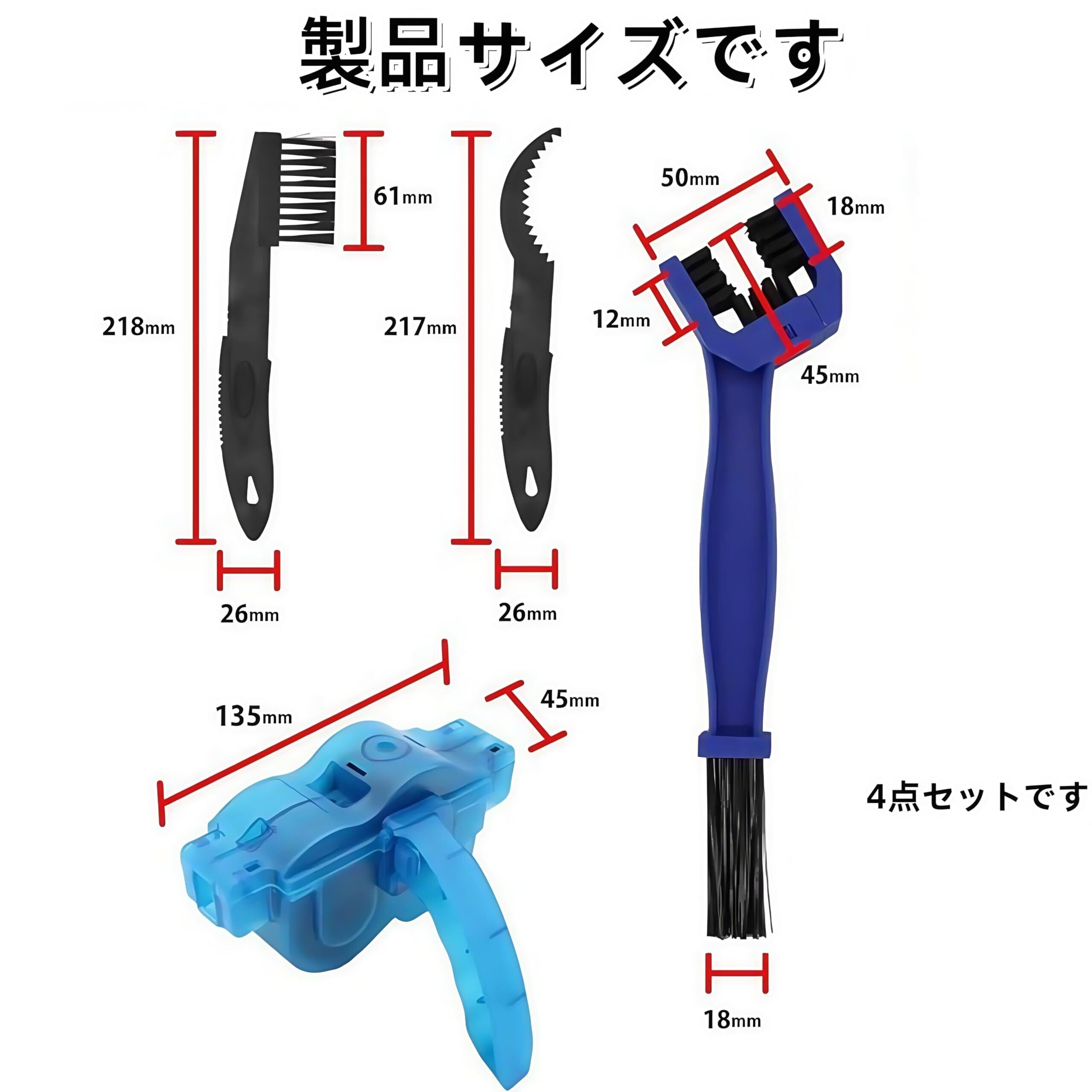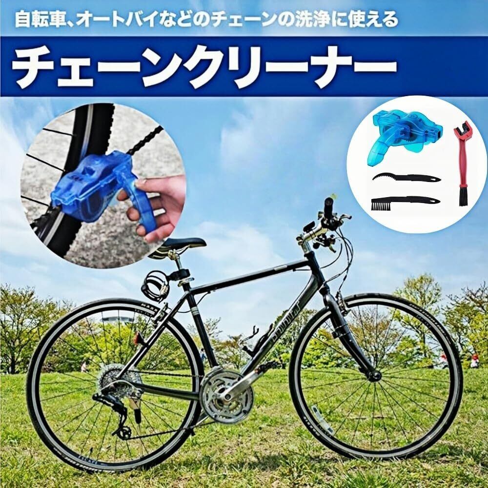 特徴:br > 1.自転車のチェーンを手軽に洗浄できるチェーン洗浄器。チェーンを挟んで洗浄剤を注入し、ペダルを回すだけで、簡単に汚れを落とせます。br > 2.ギアの間に詰まった泥を効果的にかき出す特徴的なギザ状の刃と、ディレーラーやチェーンの汚れを落とすためのナイロンブラシを備えたチェーンブラシ。樹脂製で、自転車に傷をつけず、持ち運びにも便利なハンディサイズです。br > スペックです:br > 材質です:ABSbr > 色です:青ですbr > パッケージ内容です。三面チェーンブラシ+ブラシ×2+チェーン洗浄器。br > 備考ですbr > 手動測定により、サイズと重量に一定の誤差がある場合があります。