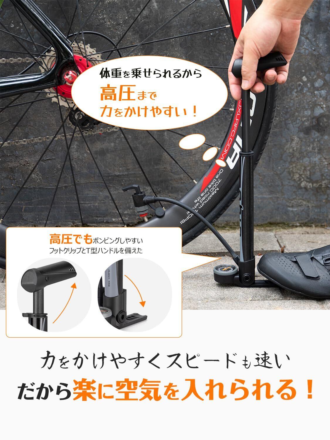 【空気を入れやすい】フロアポンプのように足でポンプを固定して、ハンドルに体重をかけてしっかり高圧まで入れられます。