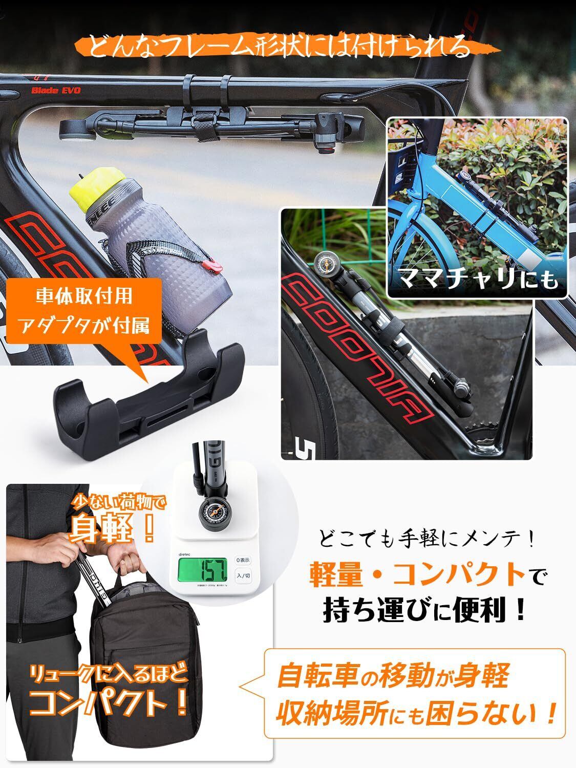 GIYO 自転車 空気入れ 携帯ポンプ 仏式 英式 米式 120psi ゲージ付き コンパクト 軽量 ミニフロアポンプ ロードバイク クロスバイク ママチャリ 各種 対応 (GM-642)