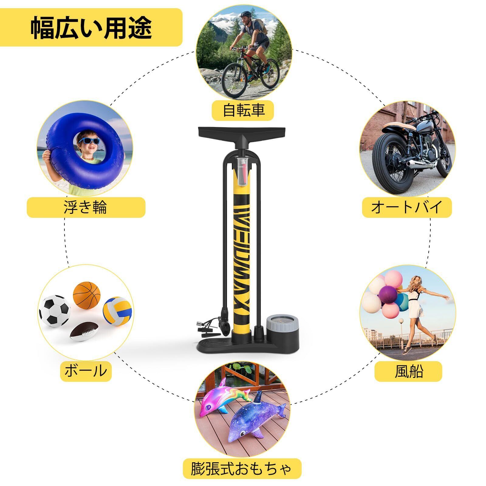 【幅広い用途】 -このフロアポンプは、一般的なシングルバルブ対応ポンプと互換性があります。自転車、電動自転車、オートバイ、ロードバイク、浮き輪、ボール、その他膨張式おもちゃなどに使用できます。