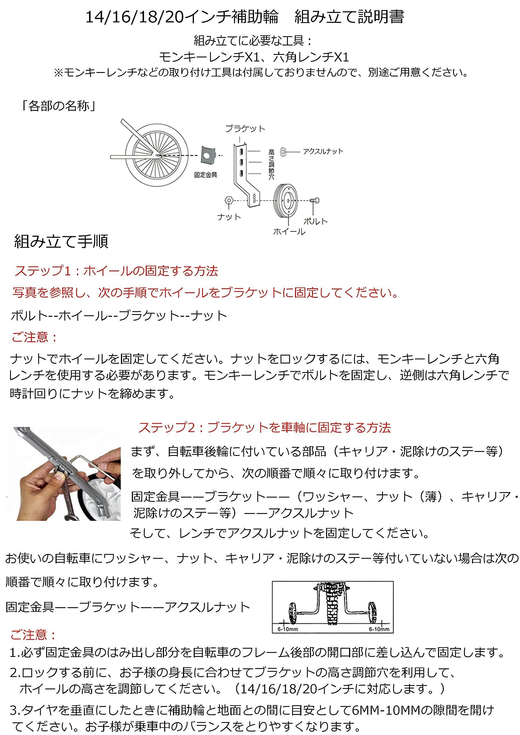2本のレンチで楽に取り付けができます。子供用自転車 補助輪が取り付け説明書と組立て時に必要な部品を付属しているのでご心配してください。(ご注意:タイヤを垂直にしたときに補助輪と地面との間に目安として6MM-10MMの隙間を開けてください。)