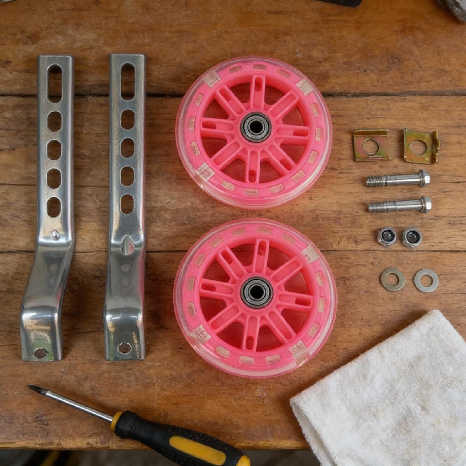 【耐久性に優れた素材】: 高品質な金属を使用した補助輪は、丈夫で摩耗に強く、長期間の使用に耐え得る設計。お子様の安全とバランス感覚をしっかりサポートします。