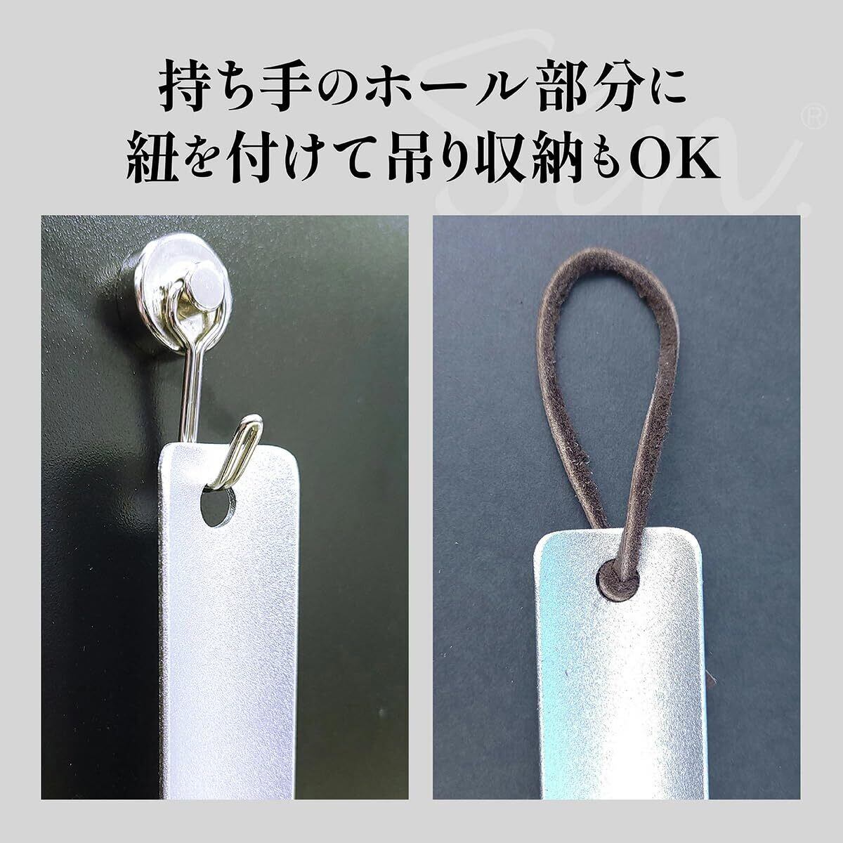 どんなインテリアにもなじむ、シンプルでミニマルなデザインの自立式靴べらです。 使いやすさにこだわった丁度良い長さは、一度使うと他の靴べらを使う気にはなれません。 靴べらは軽量で丈夫なアルミ製。 壁掛け用のストラップを浸けたり、フックにかける為の穴を明けています。