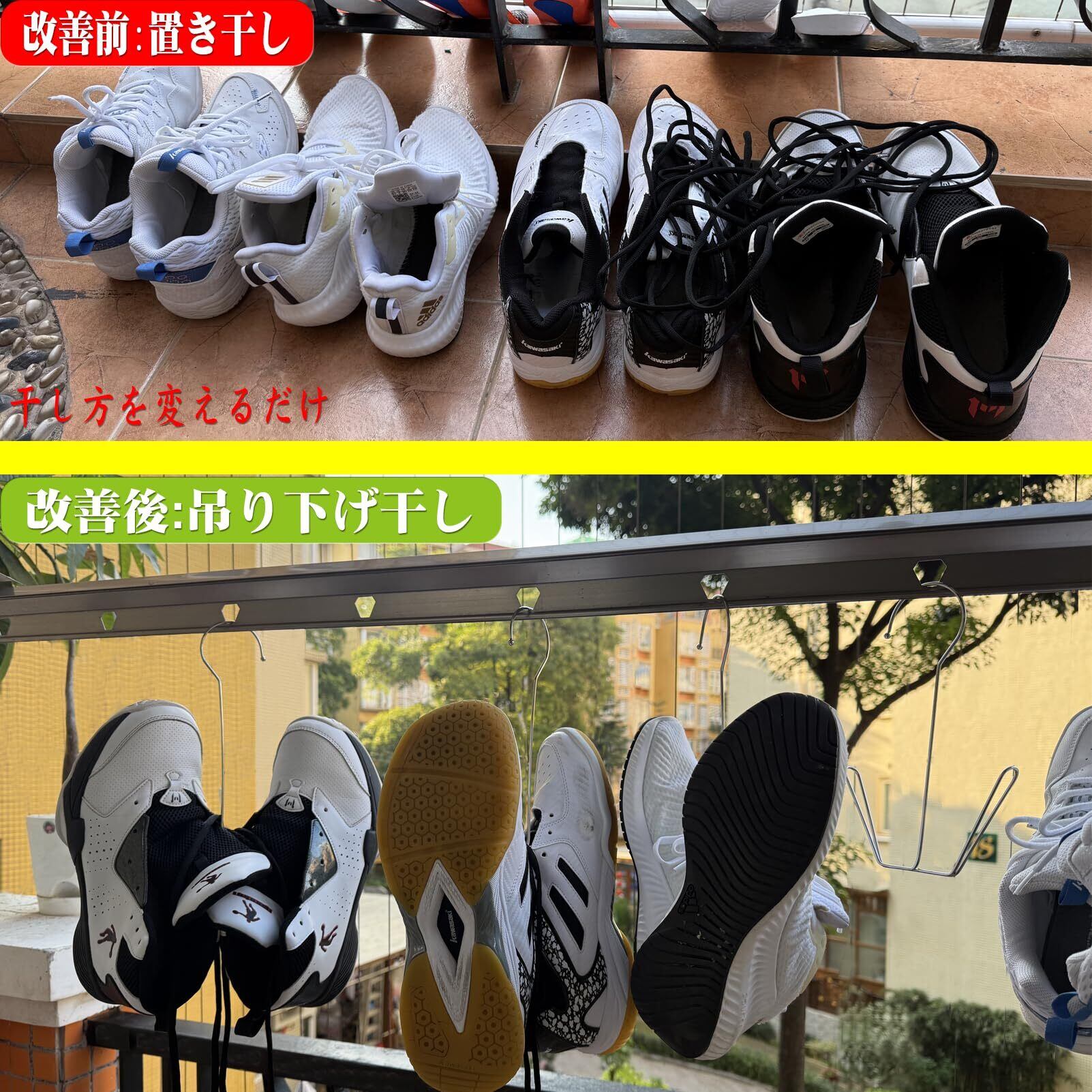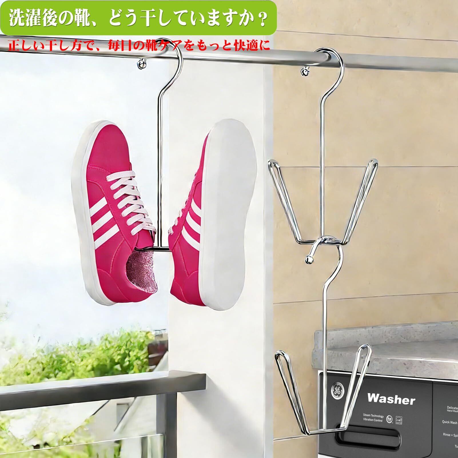洗濯後の靴を正しく乾かすために: 洗濯機で洗ったスニーカーや運動靴、子ども靴に最適。靴を浮かせて干すことで、通気性が向上し、乾きやすくなります。