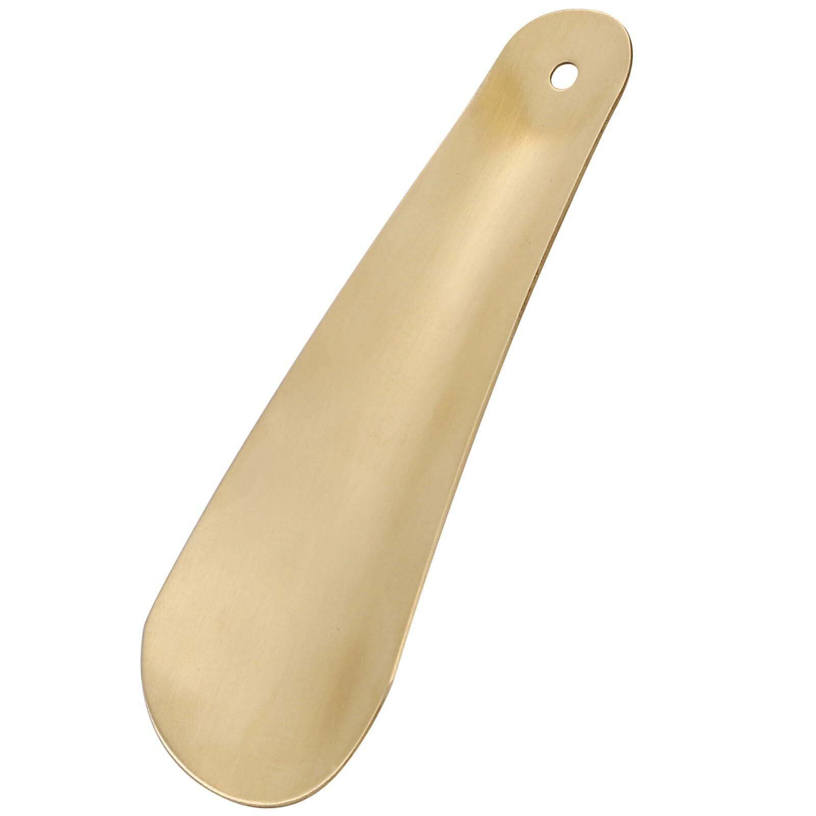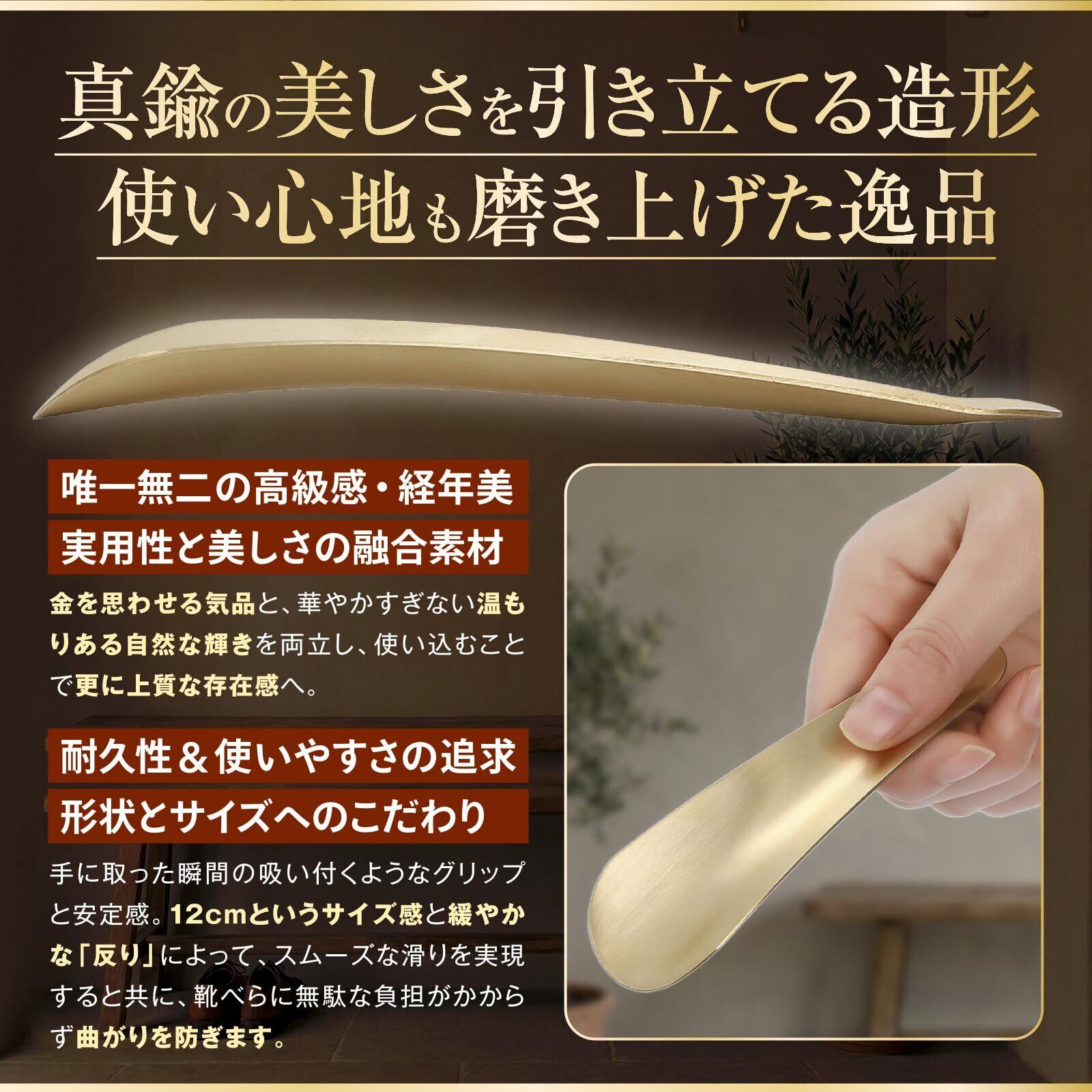 実用性と伝統美が融合した真鍮製靴べら12cm 紀元前から使われてきた真鍮は、日本では江戸時代に「山銅(やまがね)」と呼ばれ、楽器や刀装具にも用いられてきた歴史ある素材です。金のような上品な光沢を持ちながら、使い込むほどに深みを増す経年変化が魅力です。そして傷さえも味わいとなり、自分だけの風合いへと育っていきます。 そんな真鍮を無垢で贅沢に使用した靴べらとなり、手に吸い付くような持ちやすさと靴に自然と滑り込む緩やかなカーブを追求。試作を重ねてたどり着いた12cmの最適サイズは、履きやすさと携帯性を両立しました。 日々の生活が少し上質に変える、使うほどに味わい深くなる真鍮靴べらです。