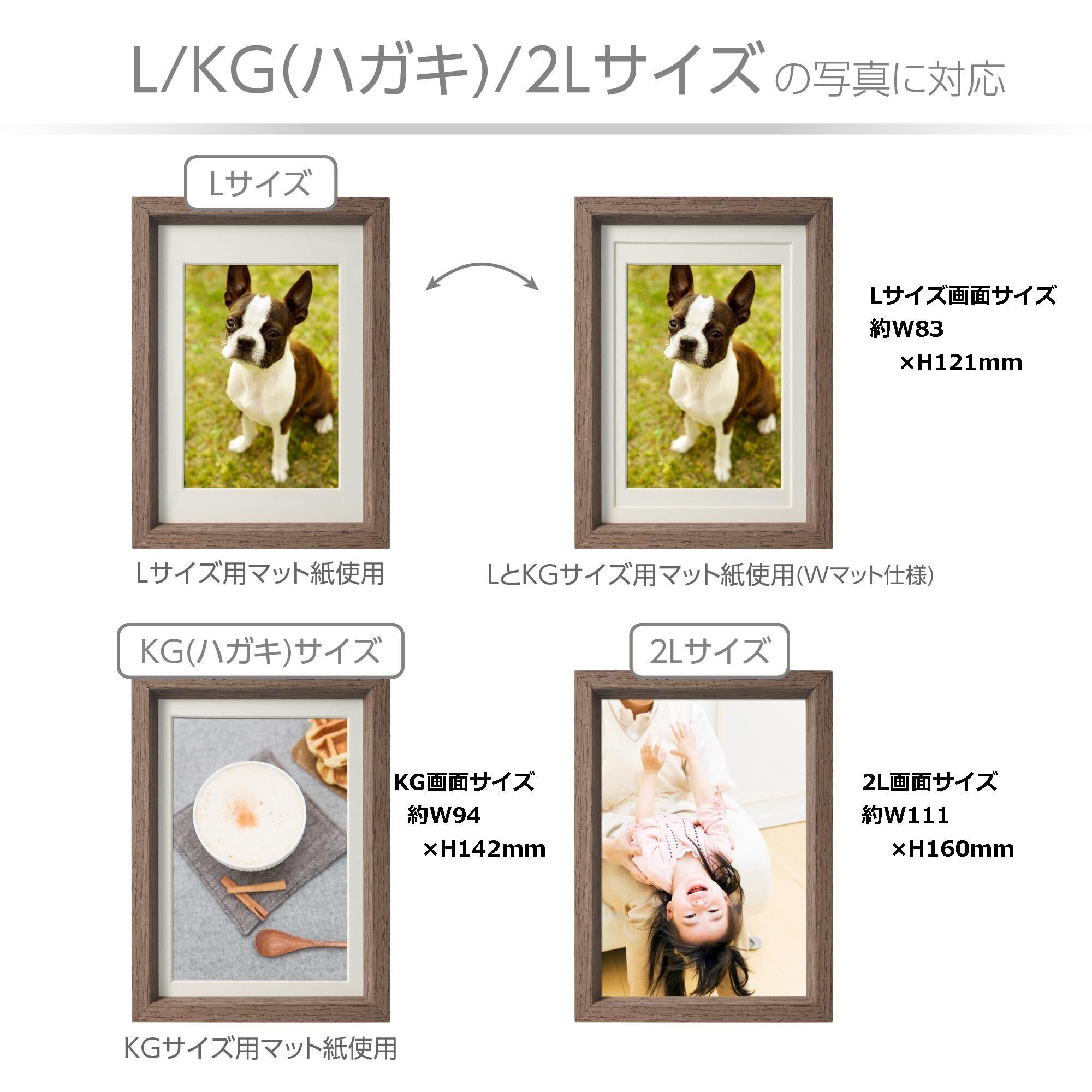 付属の2枚のマット紙を入れ替えることで、Lサイズ、KG(ハガキ)サイズ、2Lサイズの3つのサイズの写真を飾れる3WAYフォトフレームです。