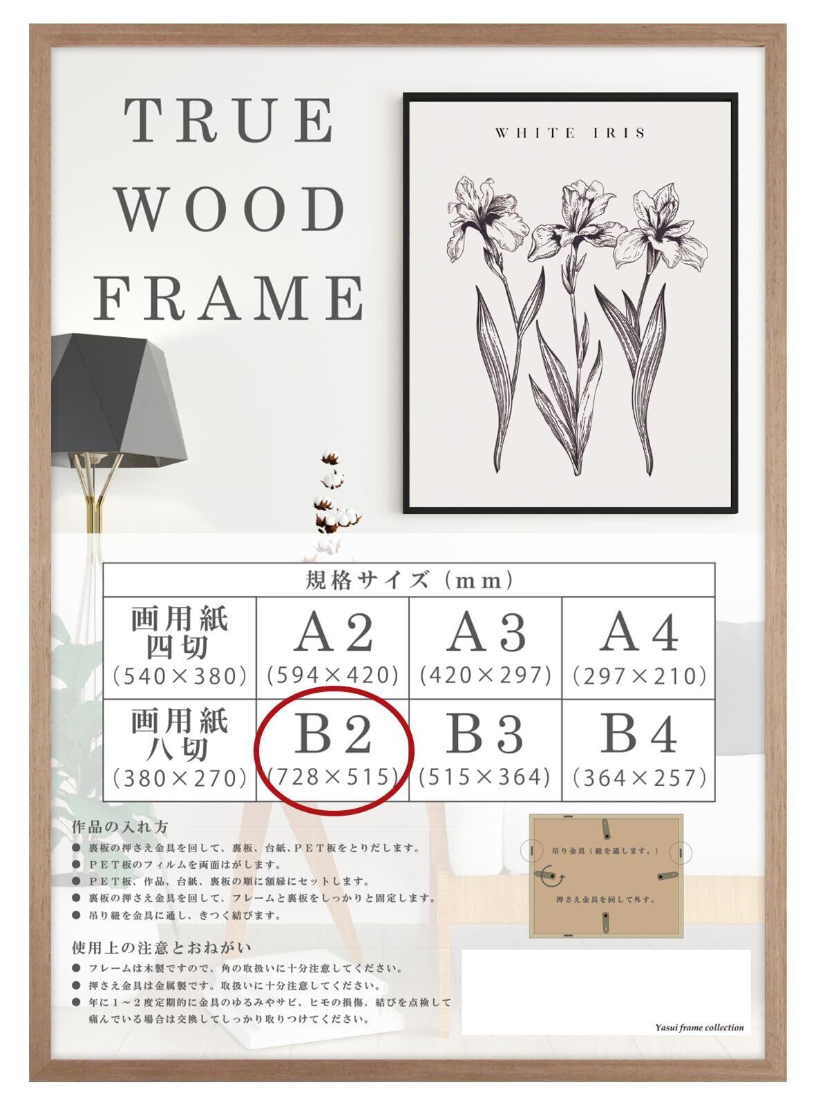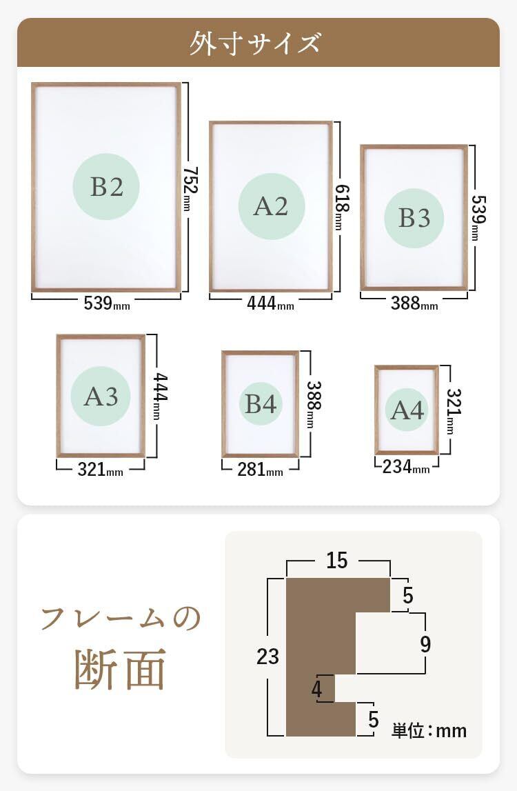 ■カラー:ナチュラル、ブラウン、ブラック ■梱包形態:箱無 OPP袋に入っております。 ■付属品:紐・吊り金具 ■素材:額(木製)、透明板(PET)裏板(MDF) ■取り扱い/注意事項:ダストカバーにPET板を使用しております。静電気により、埃が付着する事がございます。その際は乾いた柔らかい布で、埃を優しく拭き取ってください。濡れた布、固い布で、こすってしまうとPET板に傷がつく可能性がございます。 ■サイズ:コピー用紙専用フレーム (b2 a2 a3 a4 b3 b4 サイズ専用)