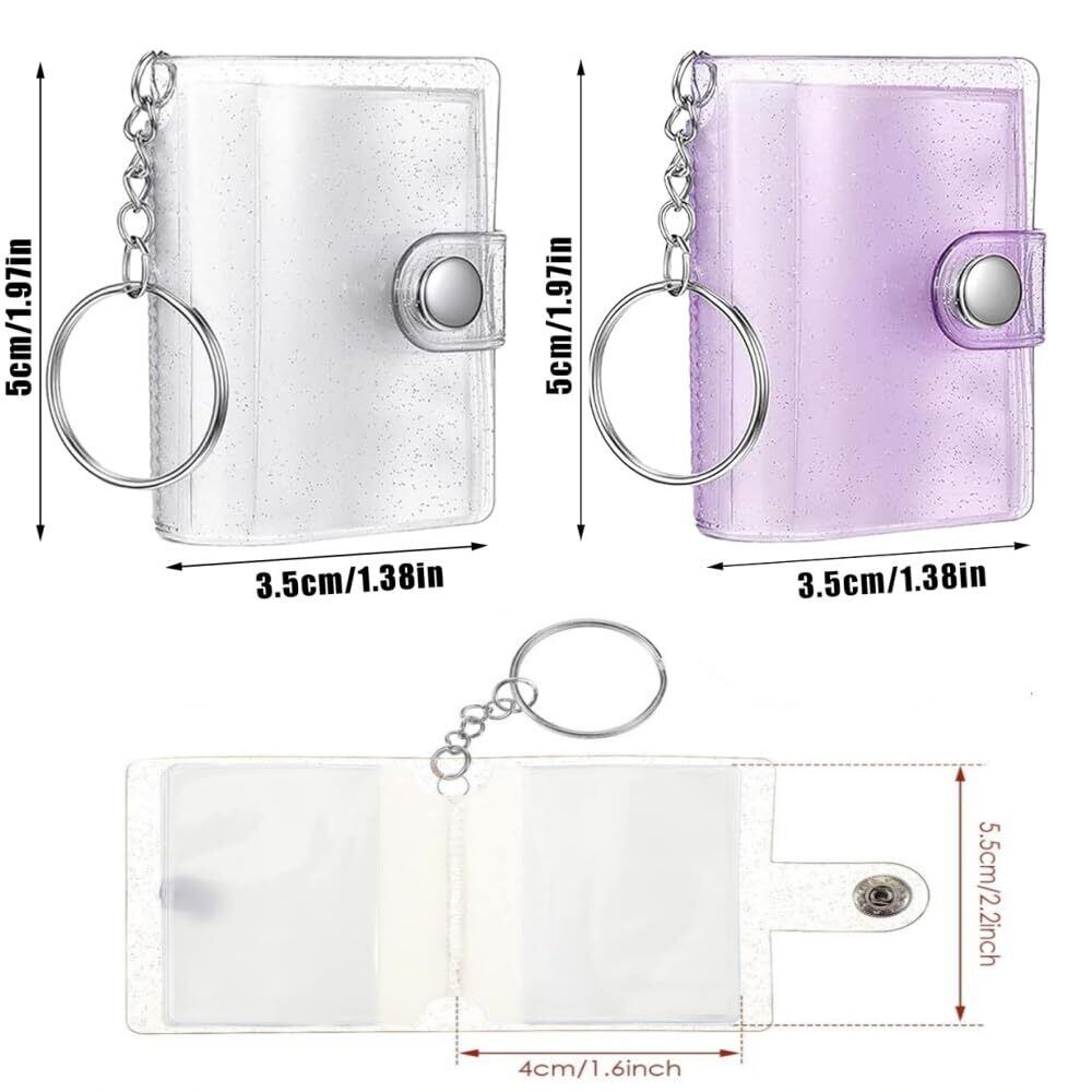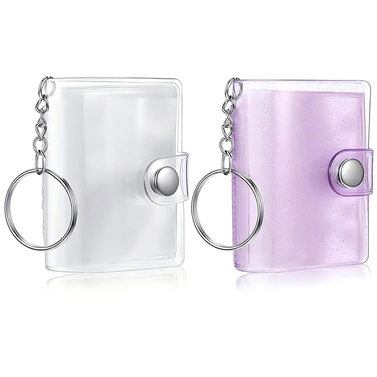 フォトアルバムキーチェーン 2個入り ミニ インタースティシャルポケット 2インチ 透明 持ち運び便利 防水 バインダー 写真収納 内ページ40枚付属 ((透明+パープルフラッシュ))