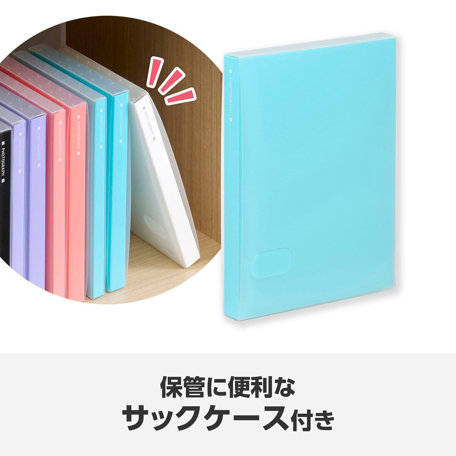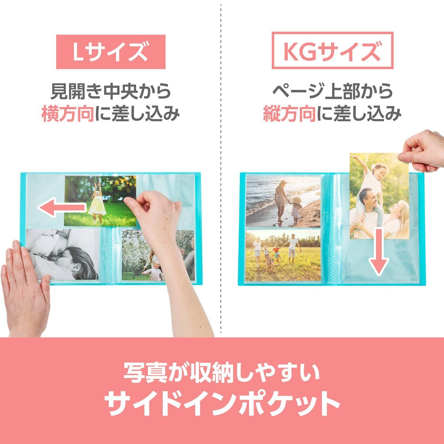 ■対応写真サイズ:Lサイズ(W127×H89mm)・KGサイズ(W152×H102mm) ■表紙サイズ:約W154×H200×D19mm ■収納枚数:Lサイズ80枚またはKGサイズ40枚
