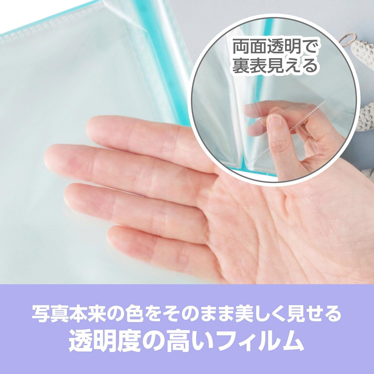 写真本来の色合いを忠実に再現する新タイプのフィルムを採用。両面とも透明なので、表裏に絵や柄があるカード等も、収納したままどちらの面も見ることができます。
