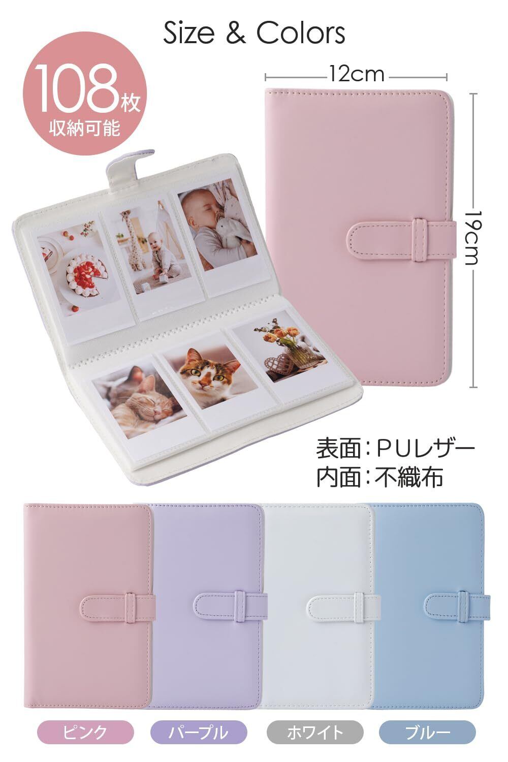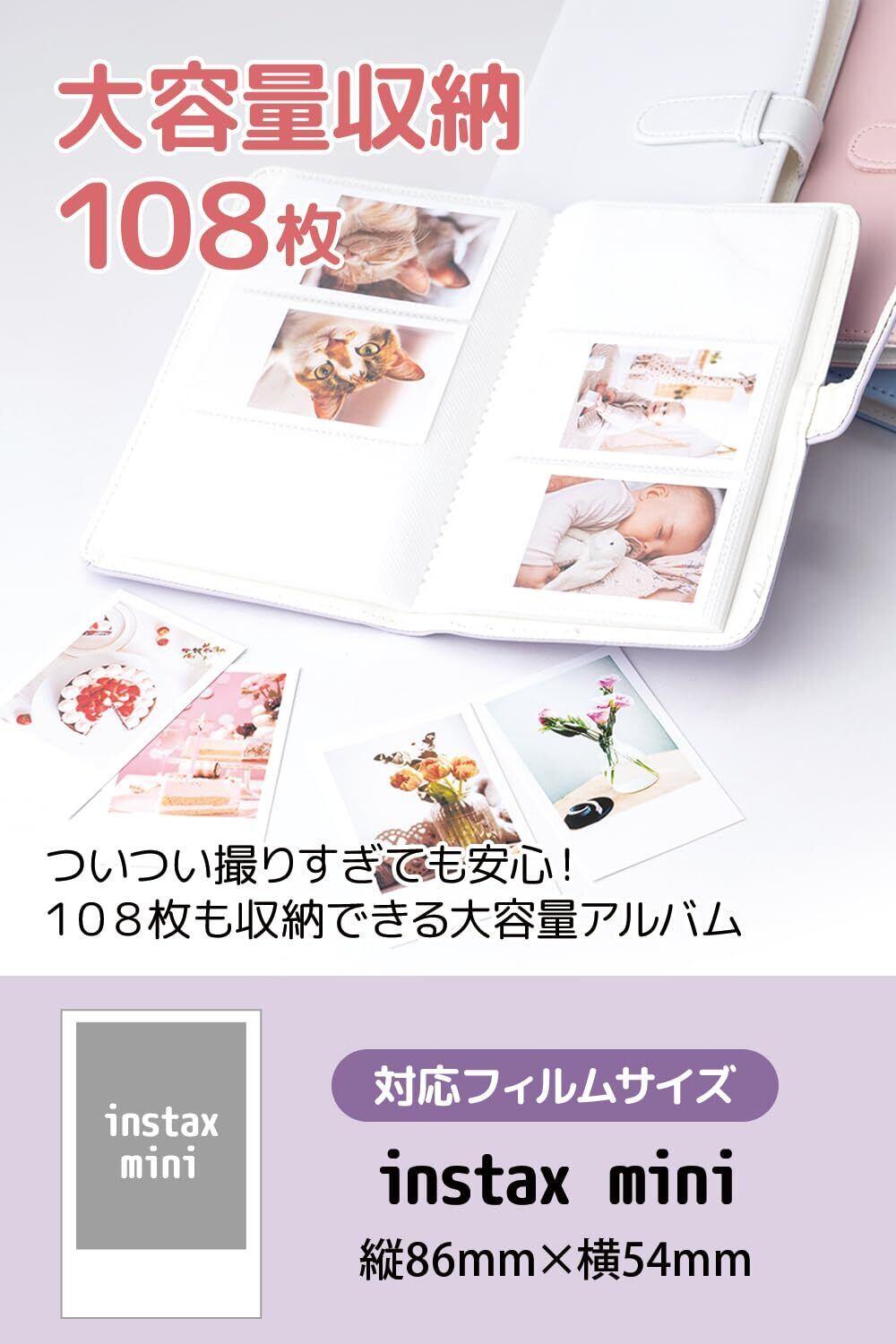 【【コンパクトで軽量】コンパクトで簡単に持ち運べるサイズです。軽量な素材であるPVCを使用していることで、子供から大人まで、幅広く支持されている定番のチェキアルバムです。ついつい撮りすぎても安心の108枚も収納できる大容量アルバムです。●対応フィルムサイズ:instax mini