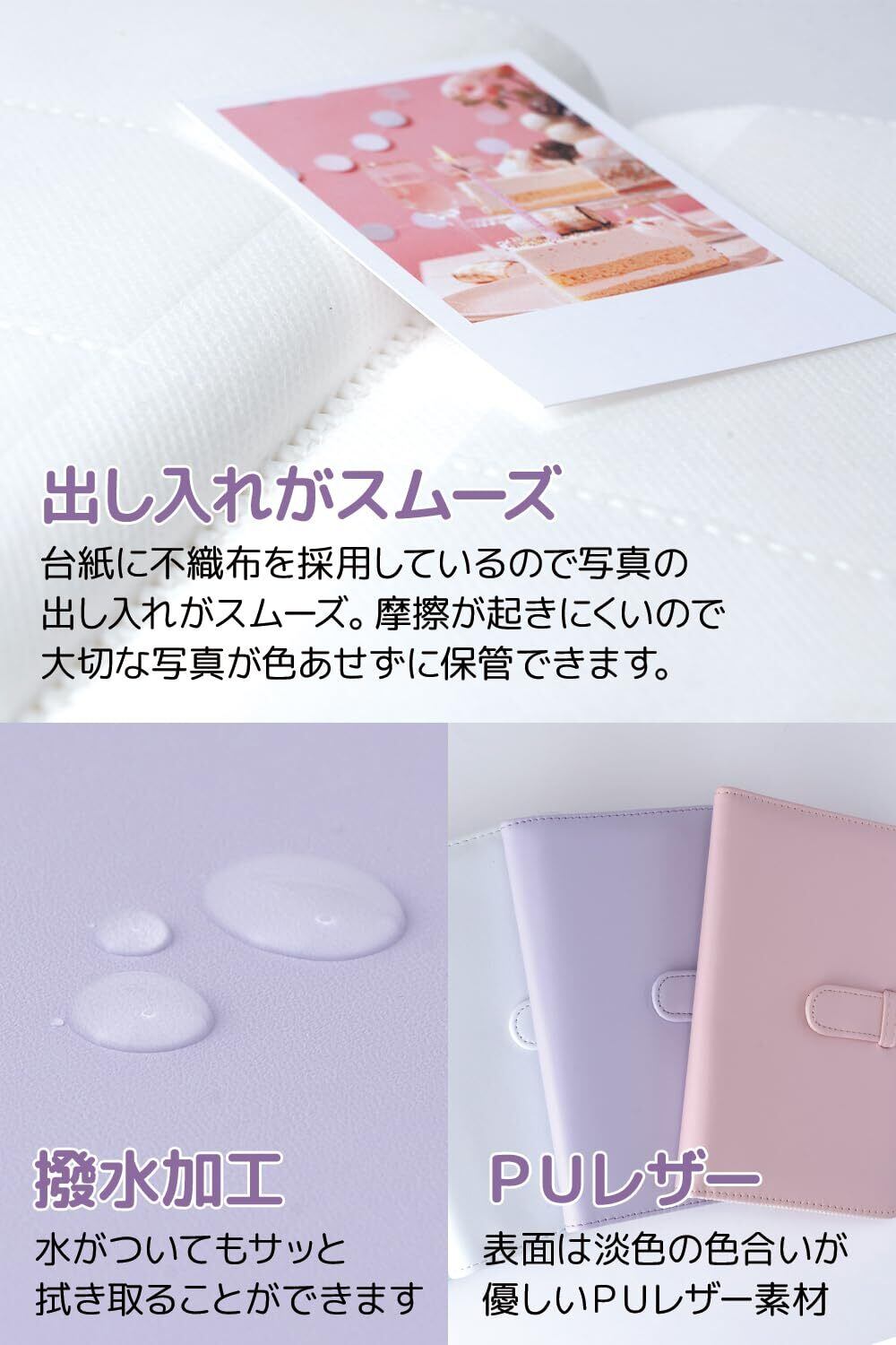 【 撥水加工 】 表面はPUレザー製で、撥水加工が施されています。水滴がついてもサッと拭き取ることができ、中の写真を守ります。