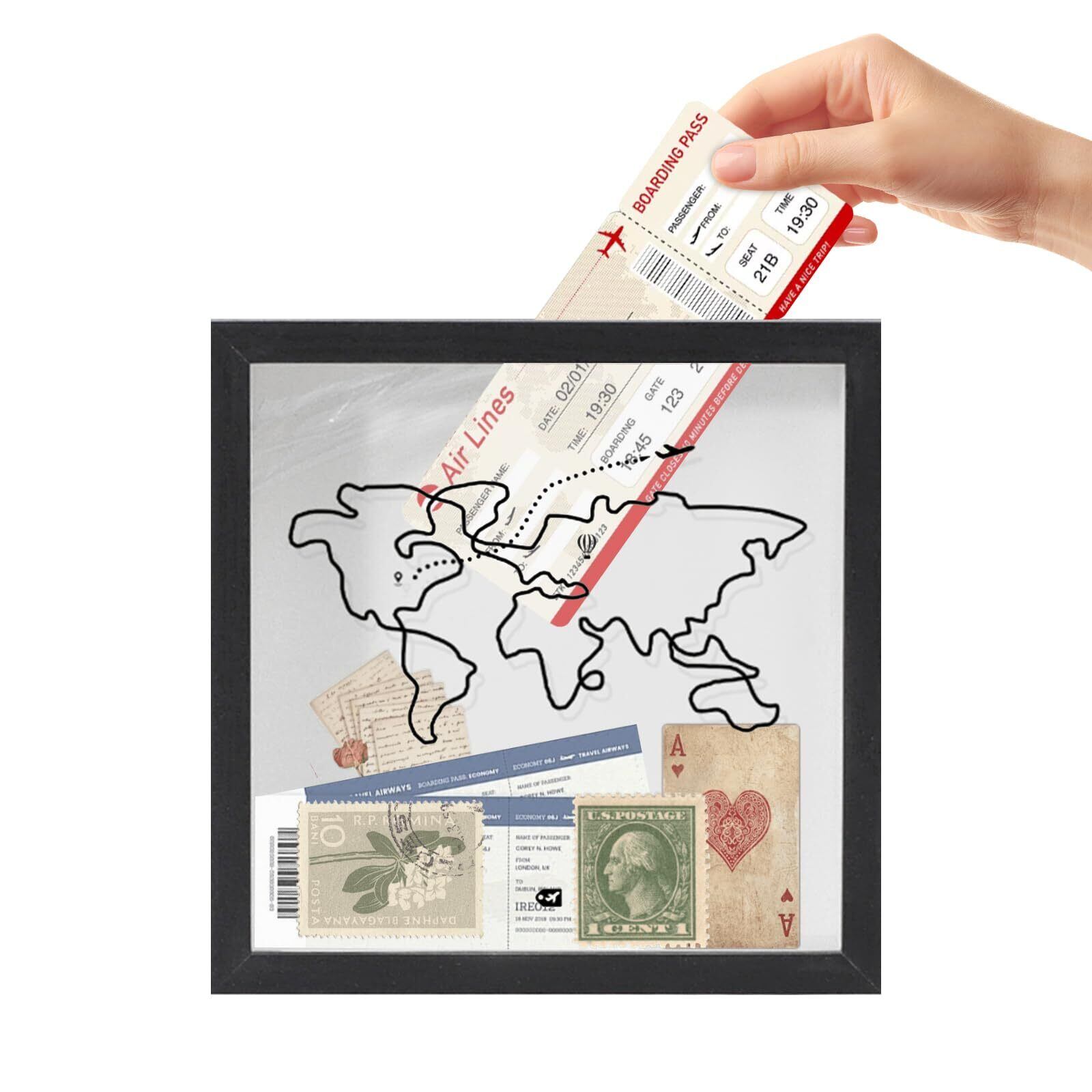 トラベルアドベンチャー シャドーボックス チケット シャドウボックス 冒険アーカイブボックス トラベルメモリーボックス チケットホルダー 上部にスロット付き 壁掛け 写真立て ドライフラワー 標本箱 貯金箱 ディスプレイフレーム お部屋飾り (黒)