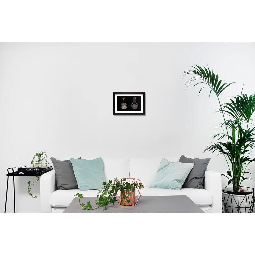 【フレームサイズ】内部寸法は29.7 x 21 cm、外部寸法は32.5 x 23.6 x 3 cm。黒いマットとガラスの間の空間は1.5 cmで、ほとんどのサイズのメダルを収容することができますが、試合によっては大きなメダルは除外されています。
