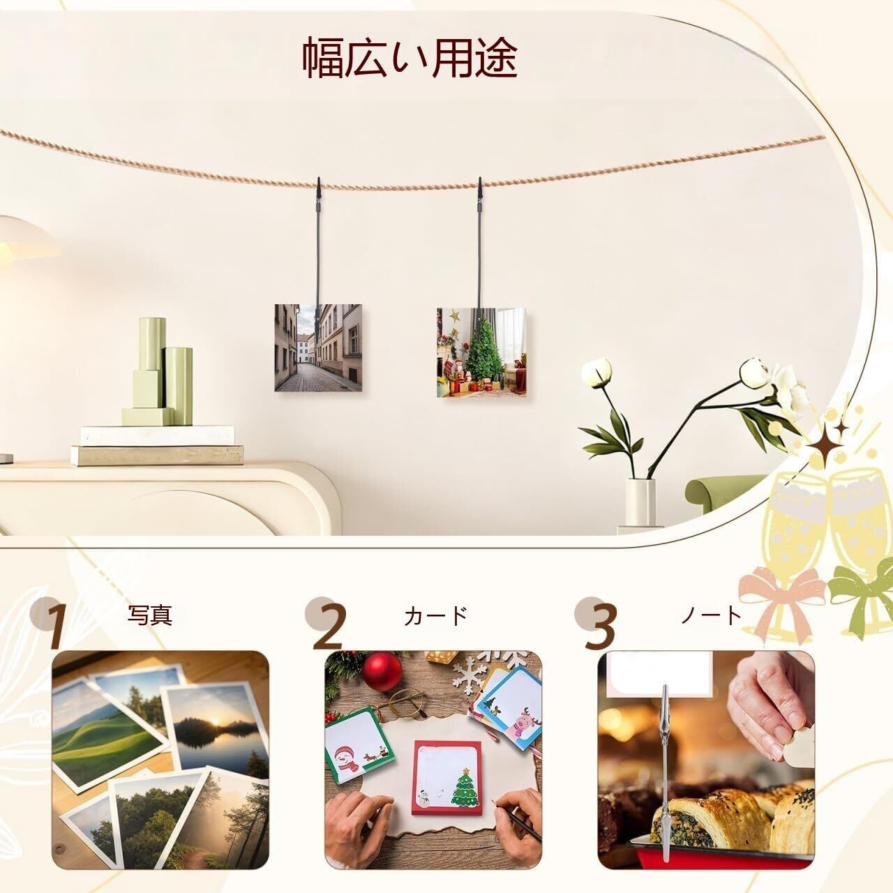 【写真用クリップ】写真を壁に掛けるのに最適で、美しいウォールアート装飾を簡単に作ることができます。