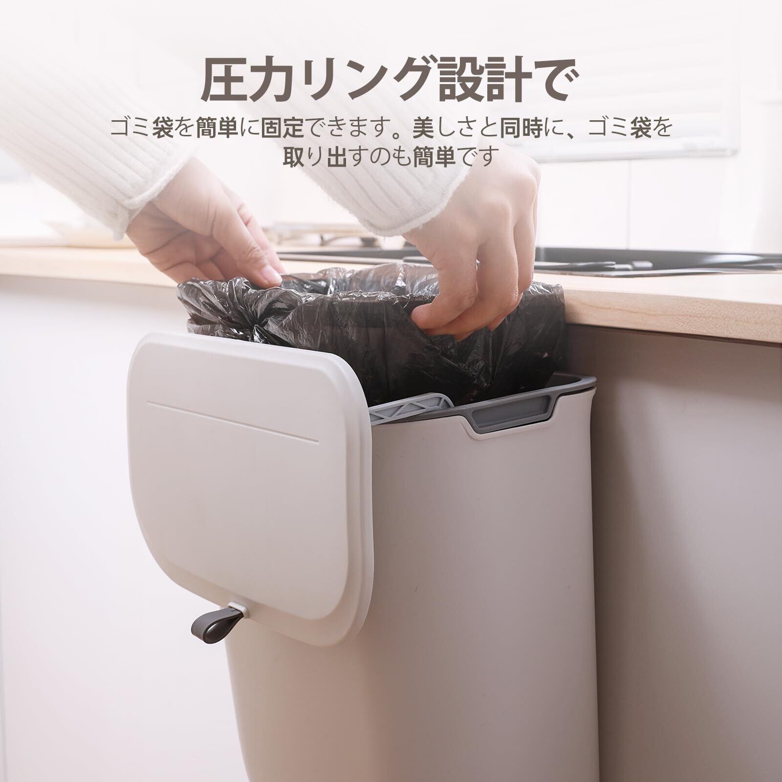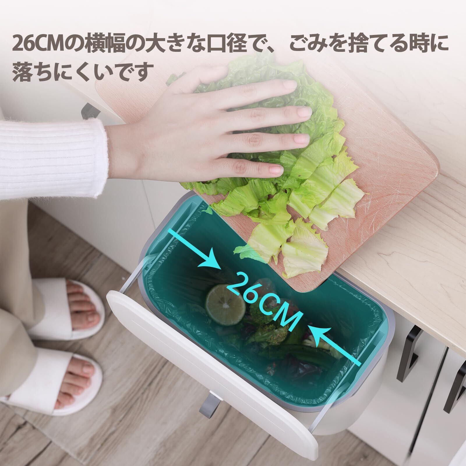2.4cmの厚さを持つキャビネットドアに適しています,26cmの横幅の大きな口径で、ごみを捨てる時に落ちにくいです。悪臭を封じ込めて、あなたに清潔なキッチンを提供します,カビの匂い、悪臭、虫を遮断して、清潔で美しい環境で良い気分を提供します。