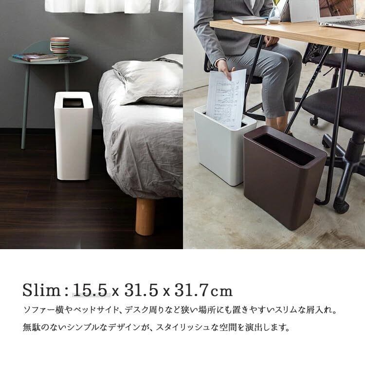 ゴミ袋のセッティングもカバーをかぶせるだけで簡単。オシャレなリビングや寝室などインテリアとマッチするデザイン。袋を隠すことで生活感を無くし、景観と調和するくず入れ。デスクサイドでも使える場所を取らないスリムタイプ。