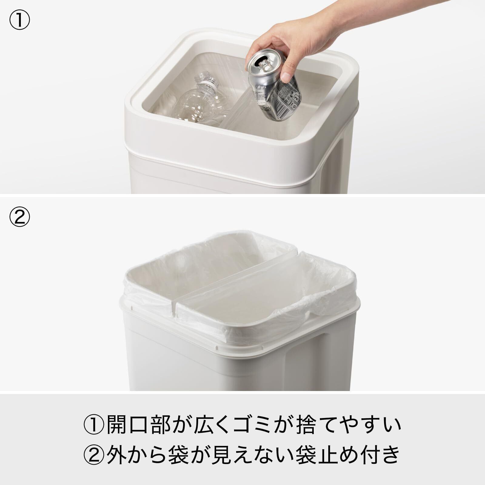 スリムな設計で容量たっぷり。開口部分が広く捨てやすいゴミ箱。袋クリップホール構造でゴミ袋の設置楽々。スリット構造でダスト内分別(2種類まで)が可能。