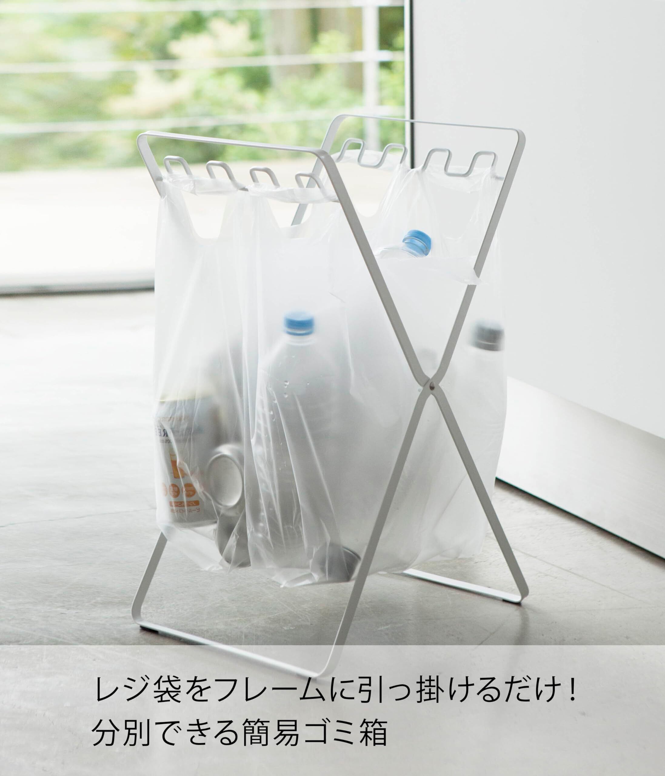 いろんなサイズのレジ袋がそのまま掛けられます。2枚掛けて分別も可能使わないときは折りたためるから収納場所に困りません。