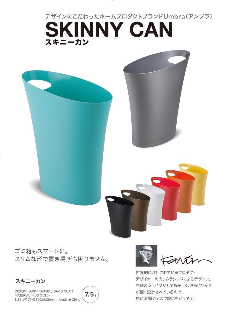 スリムなデザインなので、場所を取らずに様々な場所に置くことができる 使い勝手のよいゴミ箱 SKINNY CAN(スキニーカン) 曲線のシェイプが美しく、ワイドが細かく設計されているので、狭い隙間やデスク脇にもピッタリ。 持ち手が付いているので、ゴミを捨てる時に片手で簡単に捨てる事ができます。 【サイズ】約W170×D340×H330mm 【材質】ポリプロピレン 【生産国】中国 【容量】7.5L