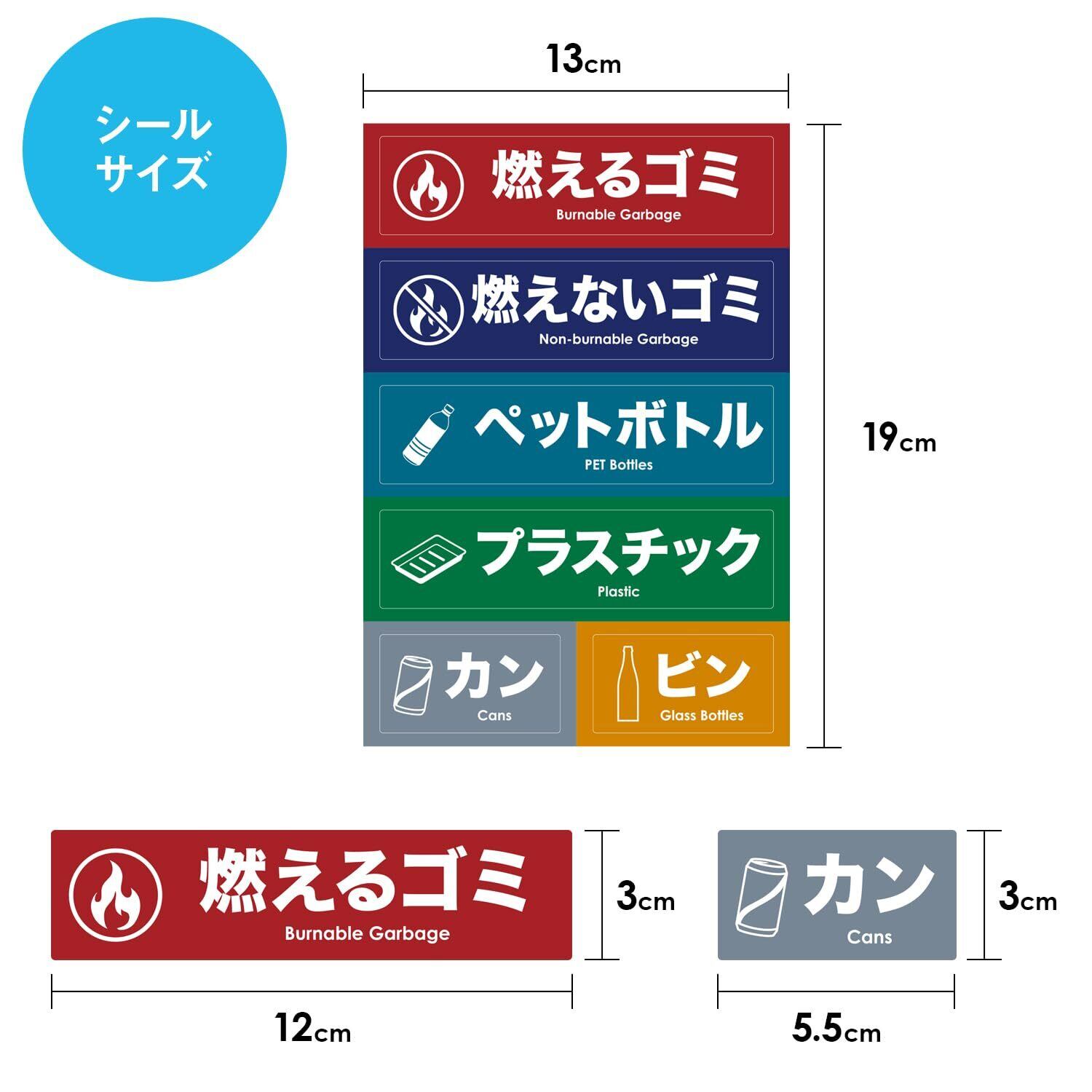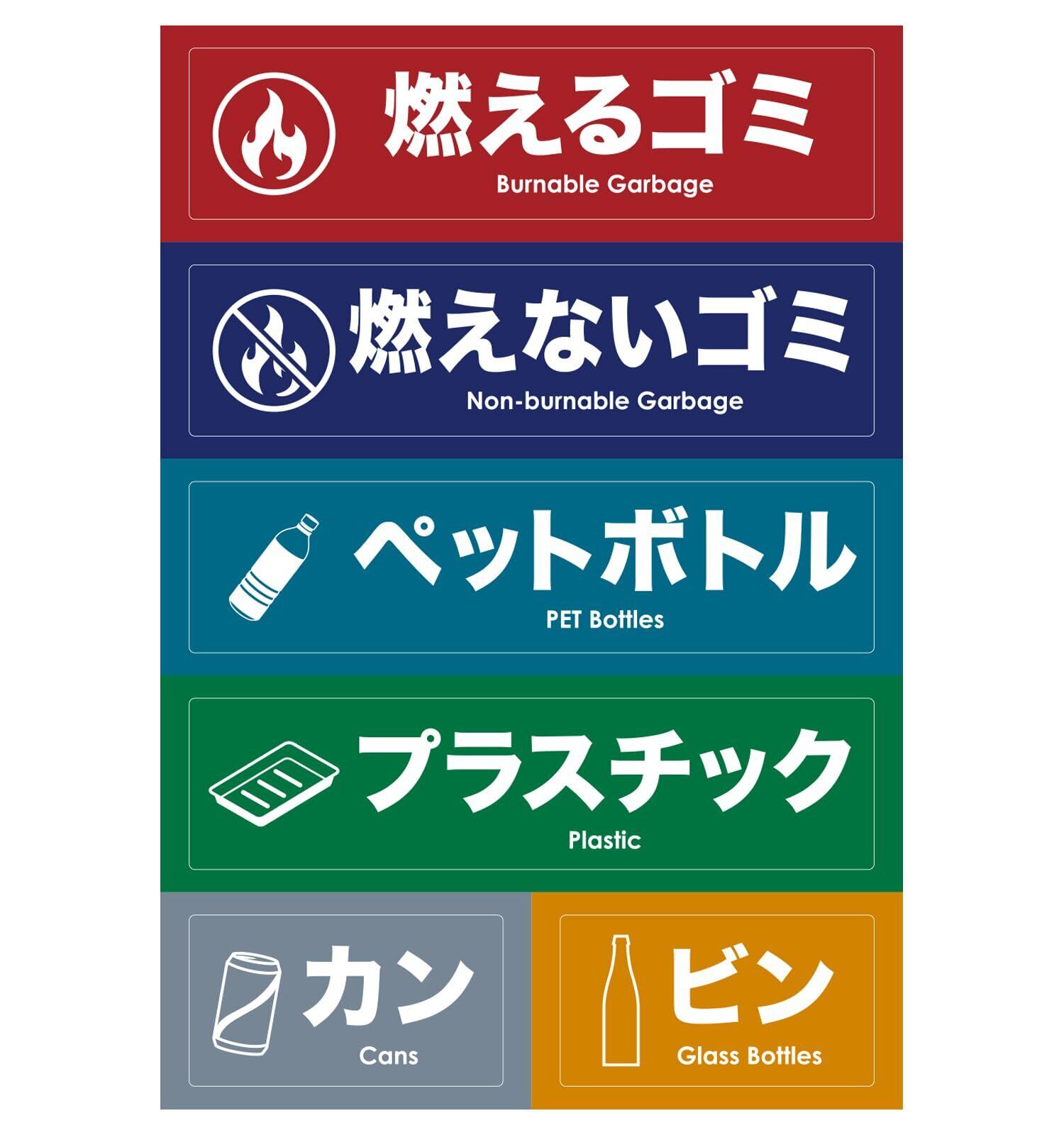 ゴミ分別ラベル 6種類セット カラフル6色 1シート 日本語英語表記 130×190mm ゴミ箱用 PVC 防水 耐水性 NYANDELMO ND-0225-R01-1sheet