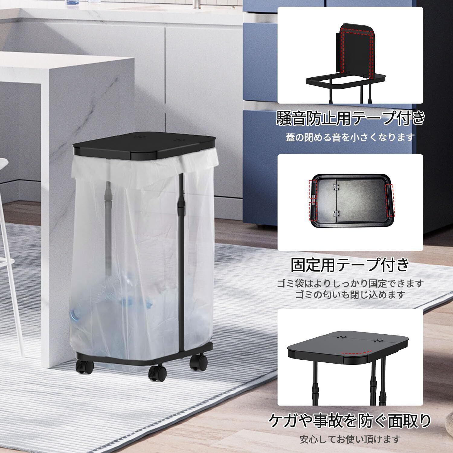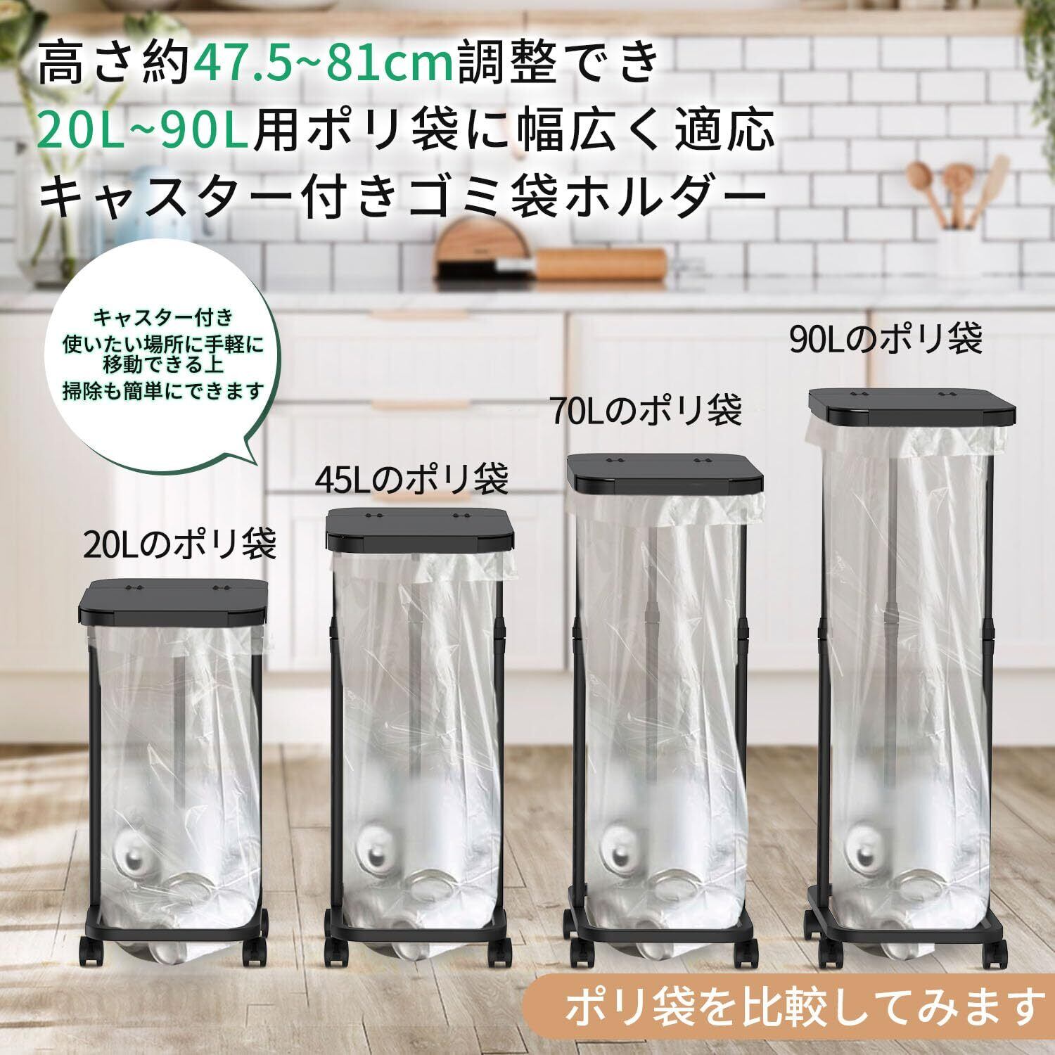 【20L~90L用ポリ袋に幅広く適応】【商品仕様】アジャスタータイプ組立後サイズ:約33.5*22*47.5~78cm キャスタータイプ組立後サイズ:約33.5*22*50.5~81cm 高さ約47.5--81cm簡単に調整できるゴミ袋ホルダーです。高さの調整だけで20L、45L、70L、90L用ポリ袋などに幅広く適応する上、スペースを取らないことも保証されます。ゴミをよりいっぱい入れることができますので、ゴミ捨ての日までに何度も袋を替える必要がない上、一人暮らしはもちろん、家庭用45lゴミ箱としても最適です。