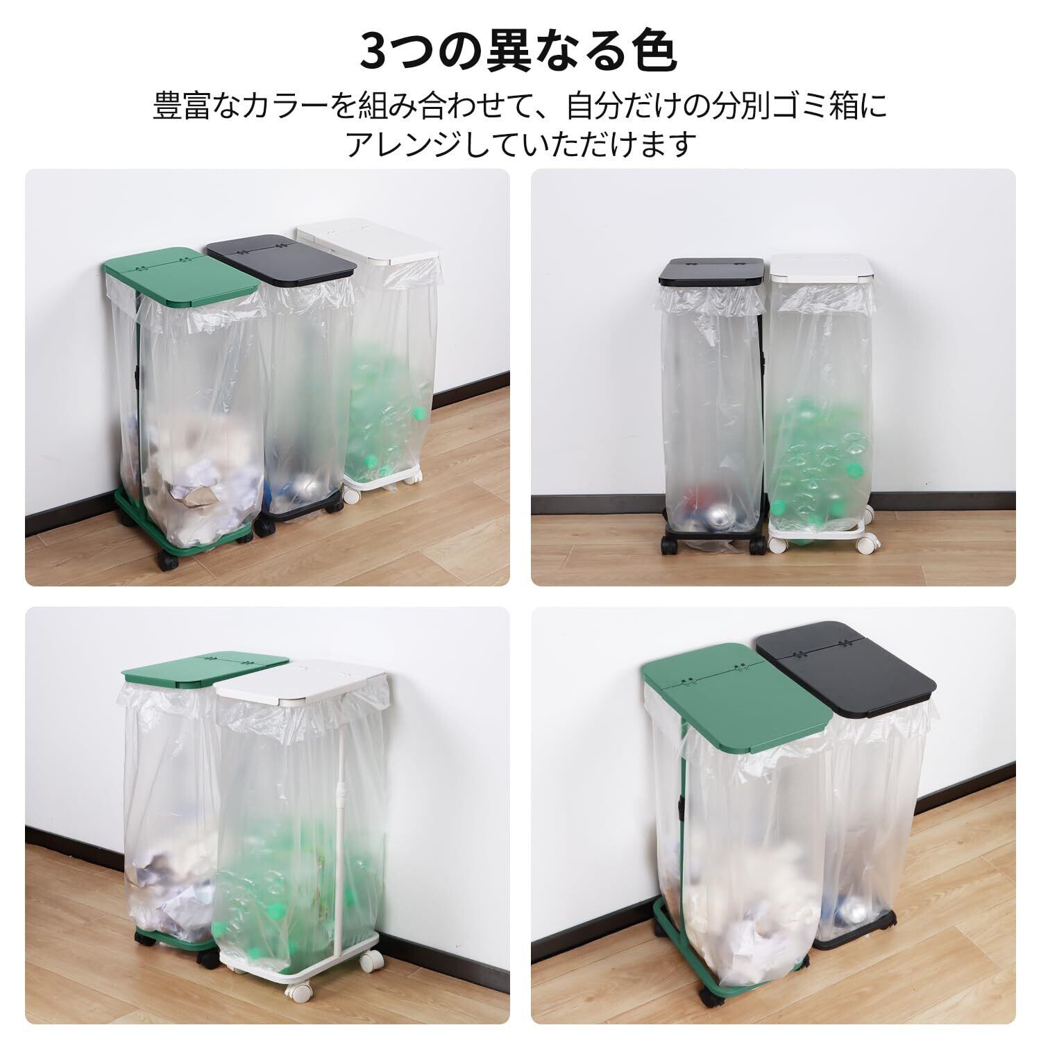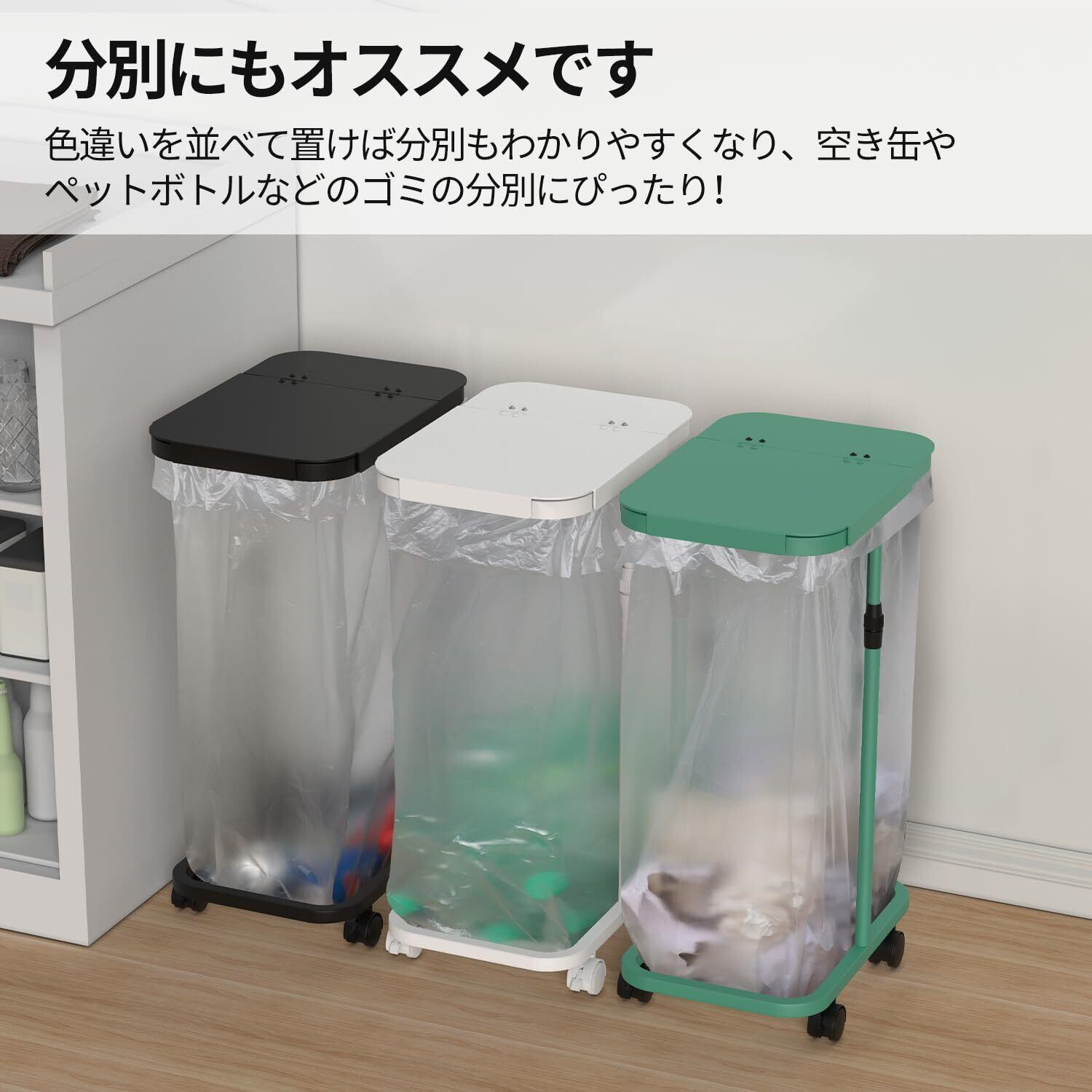 【分別にオススメ】 45lゴミ袋ホルダーには3色あり(ブラックとホワイトとグリーン)、色違いを並べて置けば分別もわかりやすくなり、プラごみ、ビン、紙類、空き缶やペットボトルなどのゴミの分別にぴったりです。ペットボトル ゴミ箱や2分別ゴミ箱、3分別ゴミ箱として適しております。