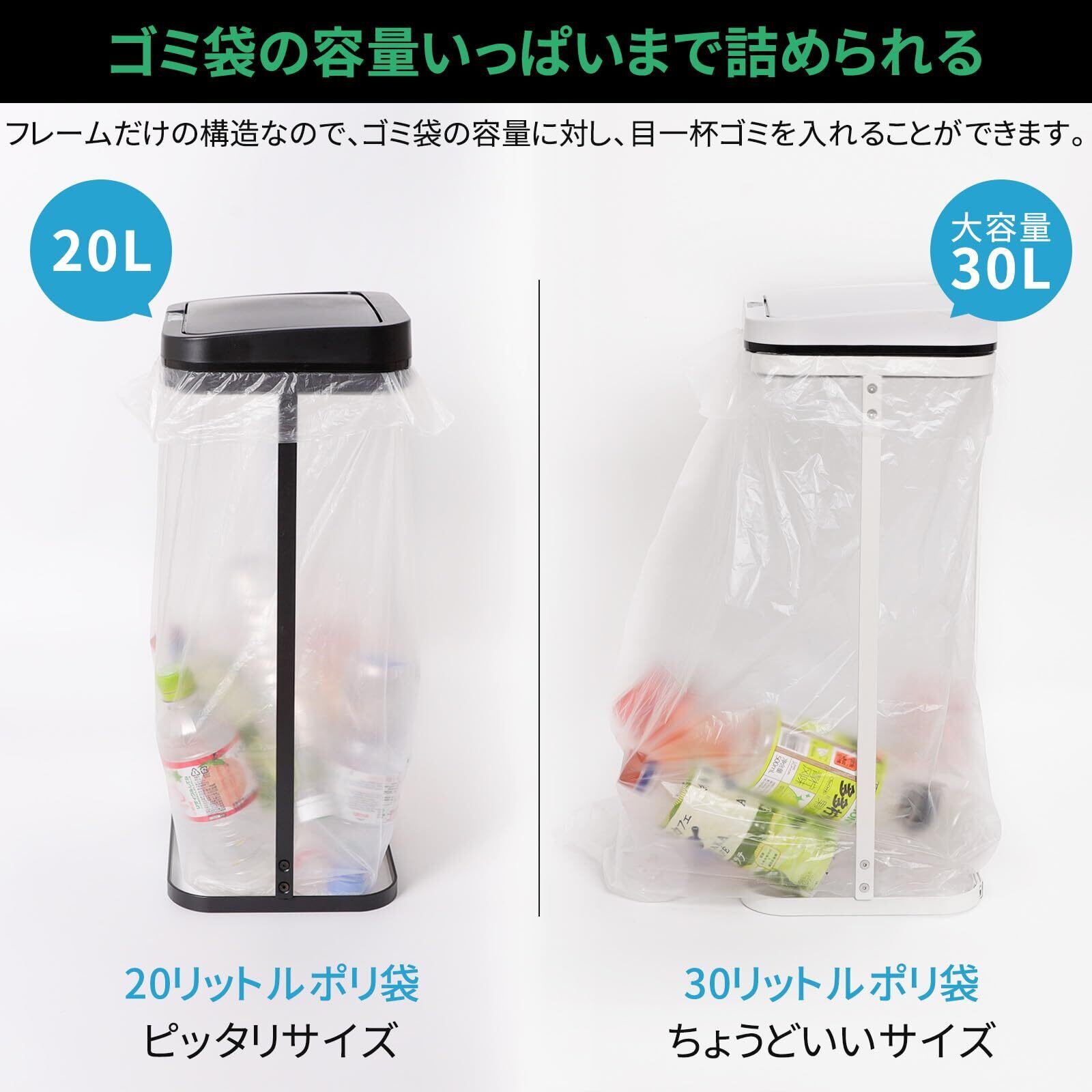 【ゴミ袋の着脱が簡単|毎日使いやすい】ゴミ袋はフレームに引っ掛けるだけでセット完了。交換時はフタを外して手前に引き抜くだけなので、ストレスなく取り替えできます。非接触センサー開閉により、ゴミ捨てのたびに手を洗う必要がなく、清潔に使えます。