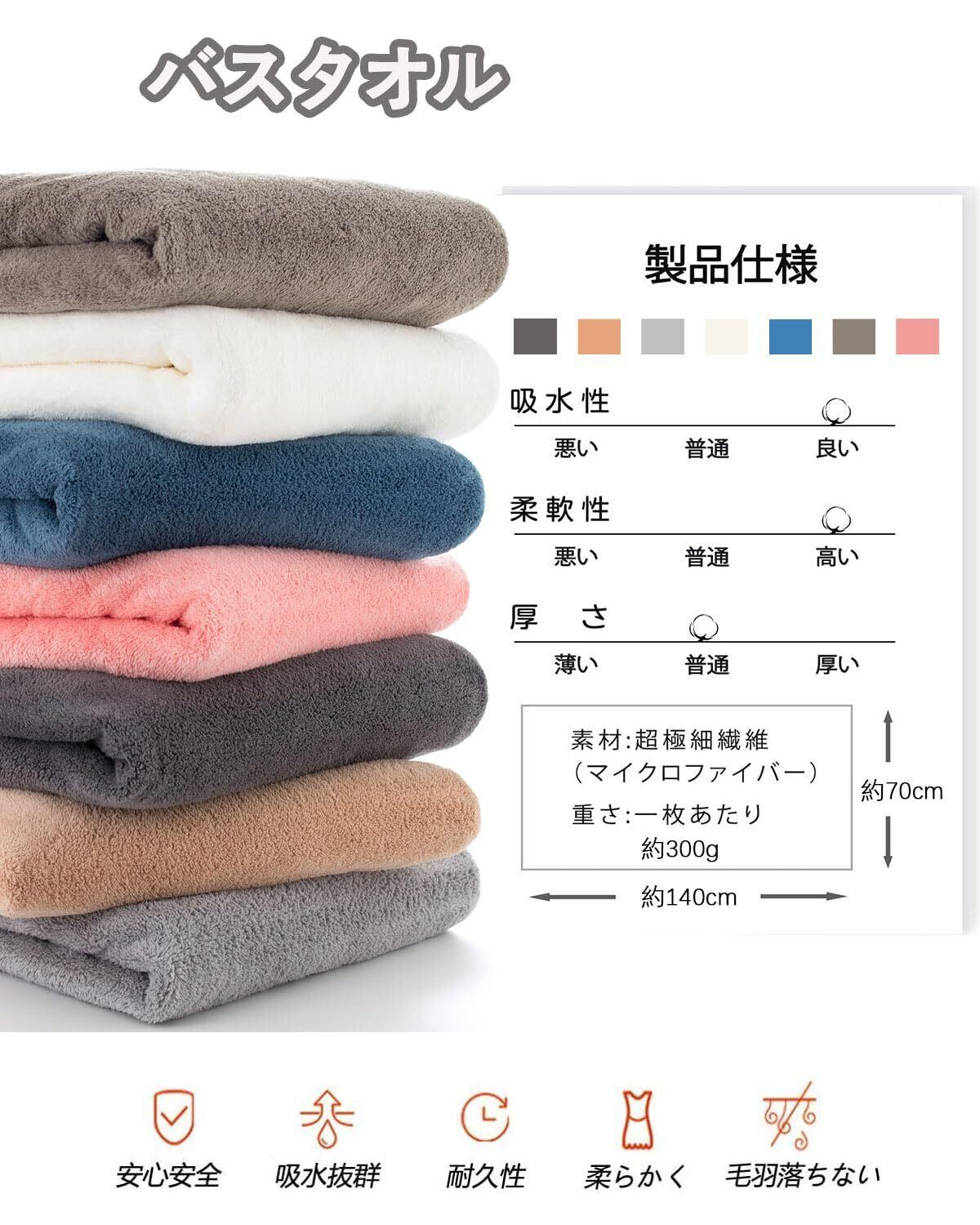 【材質】:ポリエステル85%、ポリアミド15%高級マイクロファイバー素材を採用 - このタオルは毛髪の1/100超微細繊維(マイクロファイバー)で作られたバスタオルです、触り心地最高、優しくてやわ らかい肌触りです、やさし い仕上げに蛍光染料は使用 しておりません。品質:このバスタオルが色褪せない、毛羽落ちしないことを保証します。