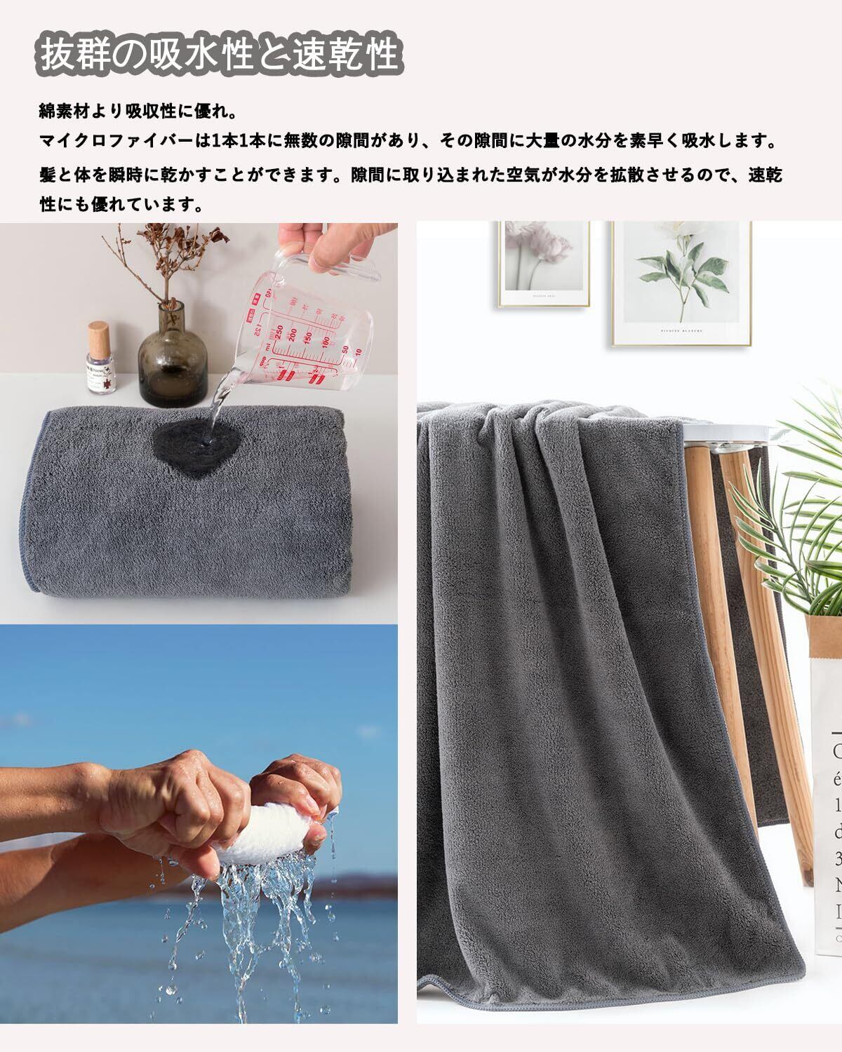 【バスタオル 4枚セット】サイズ:約70×140cm、重量:約300g(1枚あたり)セット内容: グレー4枚。出張、旅行、入浴、ご家族皆さんが満足できます、様々な場合で活躍。