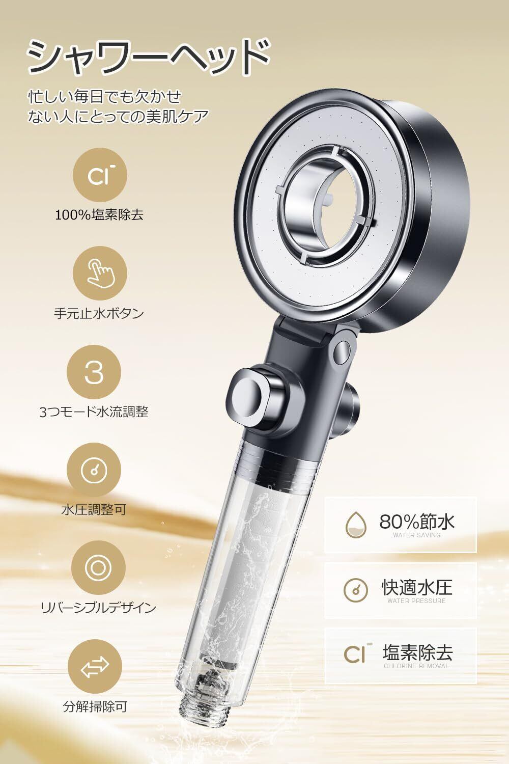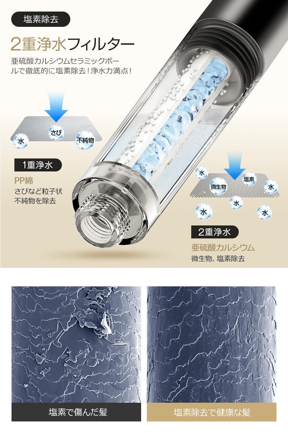 【空気混合増圧技術 × 二重浄水 × 塩素除去で快適&安心シャワー】 本製品の浄水シャワーヘッドは、空気混合増圧技術を採用し、散水板に配置された0.3mmの極細出水穴から空気を含んだパワフルな水流を生成します。低水圧の住宅やマンション高層階でもしっかりとした高水圧シャワーを実現し、毛穴奥の皮脂汚れやシャンプー残りまでしっかり洗い流します。さらに、亜硫酸カルシウムを含む塩素除去フィルターとPPコットンによる二重浄水構造を採用。残留塩素・サビ・配管由来の金属イオンなどの不純物を効果的に低減し、保温・保湿効果をサポート。肌のつっぱり感を抑え、髪のツヤ感向上にも役立つ、家族みんなにやさしいシャワーヘッドです。