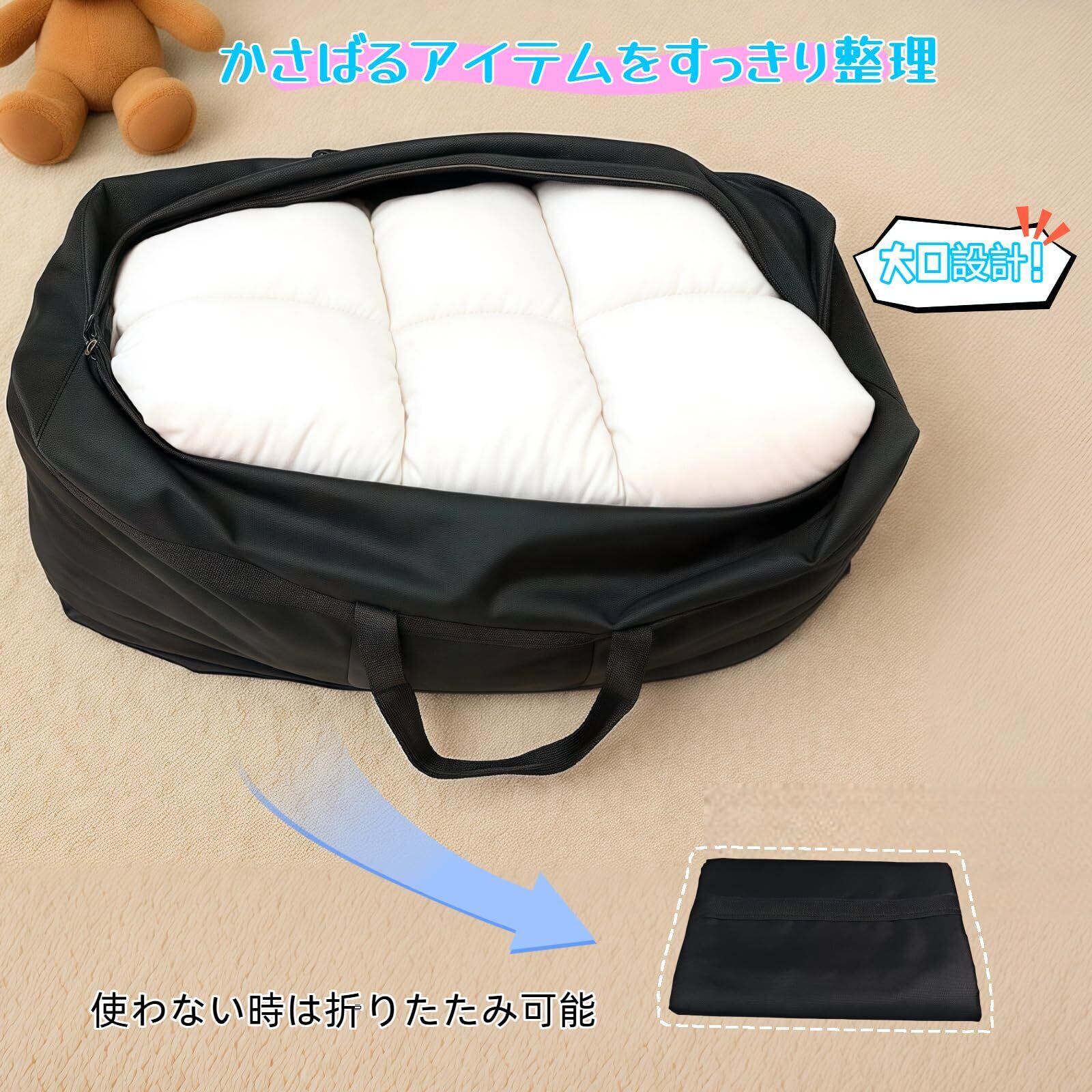 【持ち運び便利】布団袋には長い持ち手が付いています。重量物を収納した状態でも楽に持ち運べるよう配慮されており、運搬や移動が楽になります。長い持ち手がついてあり、手提げでも肩掛けでも持ちやすいです。大容量ながらも折りたたみ式デザインを採用しており、使用時にはたっぷり収納でき、使わない時にはコンパクトに折りたたんで収納可能。クローゼットの隙間やベッド下などに収納でき、場所を取らないので保管に便利で省スペースです