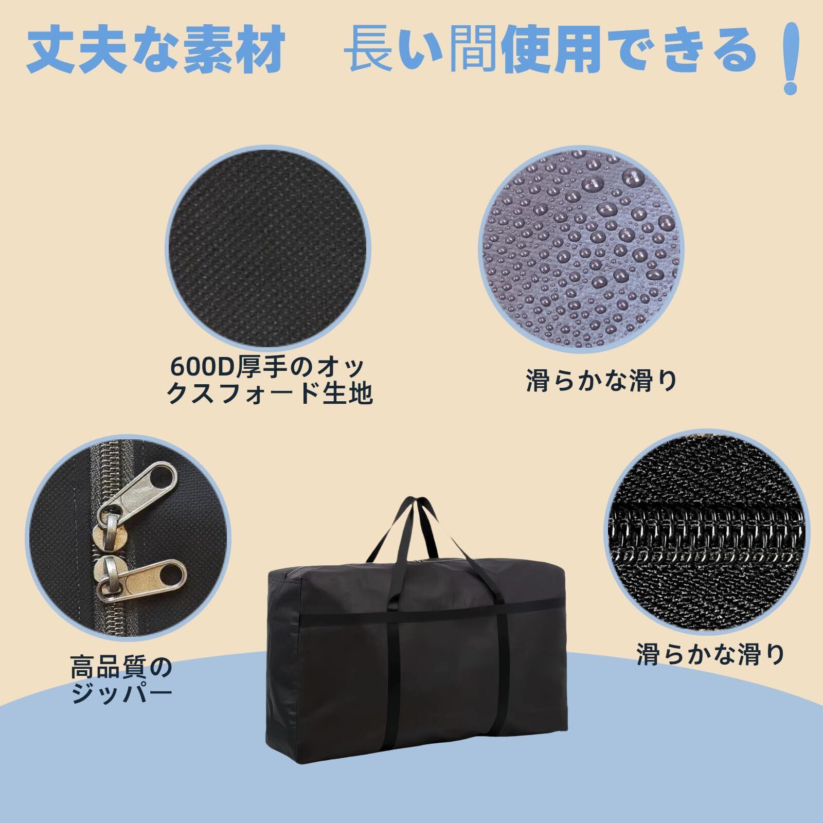 【600D頑丈で耐久性あり】この収納バッグは600Dオックスフォード生地で作られています。オックスフォード生地は特殊な織り方で作られていで、生地に強度を与え、日常の摩耗や洗濯に強くなっています。厚みがあり、優れた丈夫さと耐磨耗性を備えています