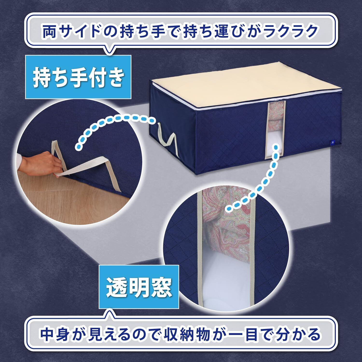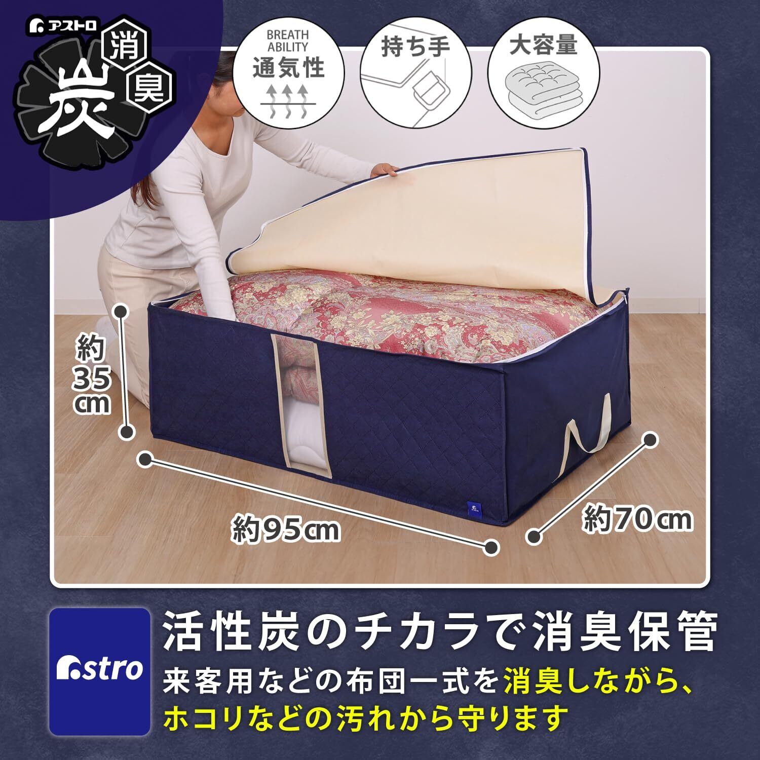 アストロ 活性炭消臭 布団収納ケース 布団一式 活性炭のチカラで消臭保管 通気性の良い不織布がホコリなどの汚れをガード 3層構造の厚手でしっかりとした生地 透明窓付き 布団収納 布団袋 引っ越し ネイビー 615-19