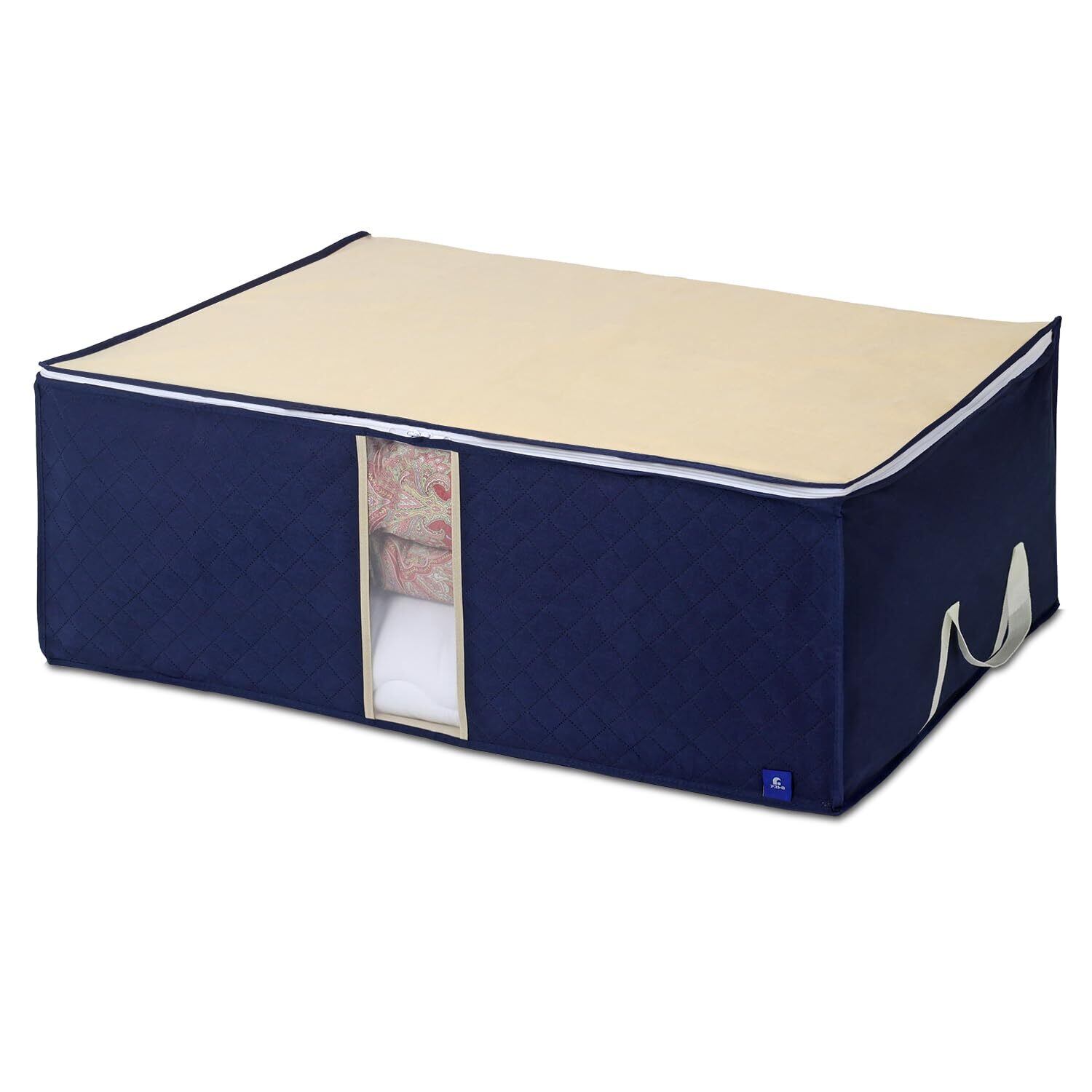 【商品仕様】:サイズ/:約幅95×奥行70×高さ35cm、カラー/ネイビー×アイボリー、内容/1個、収納目安/シングルサイズの布団一式(掛け・敷き布団各1枚)もしくはシングルサイズの敷き布団2枚、材質/ポリプロピレン・ポリエチレン・活性炭