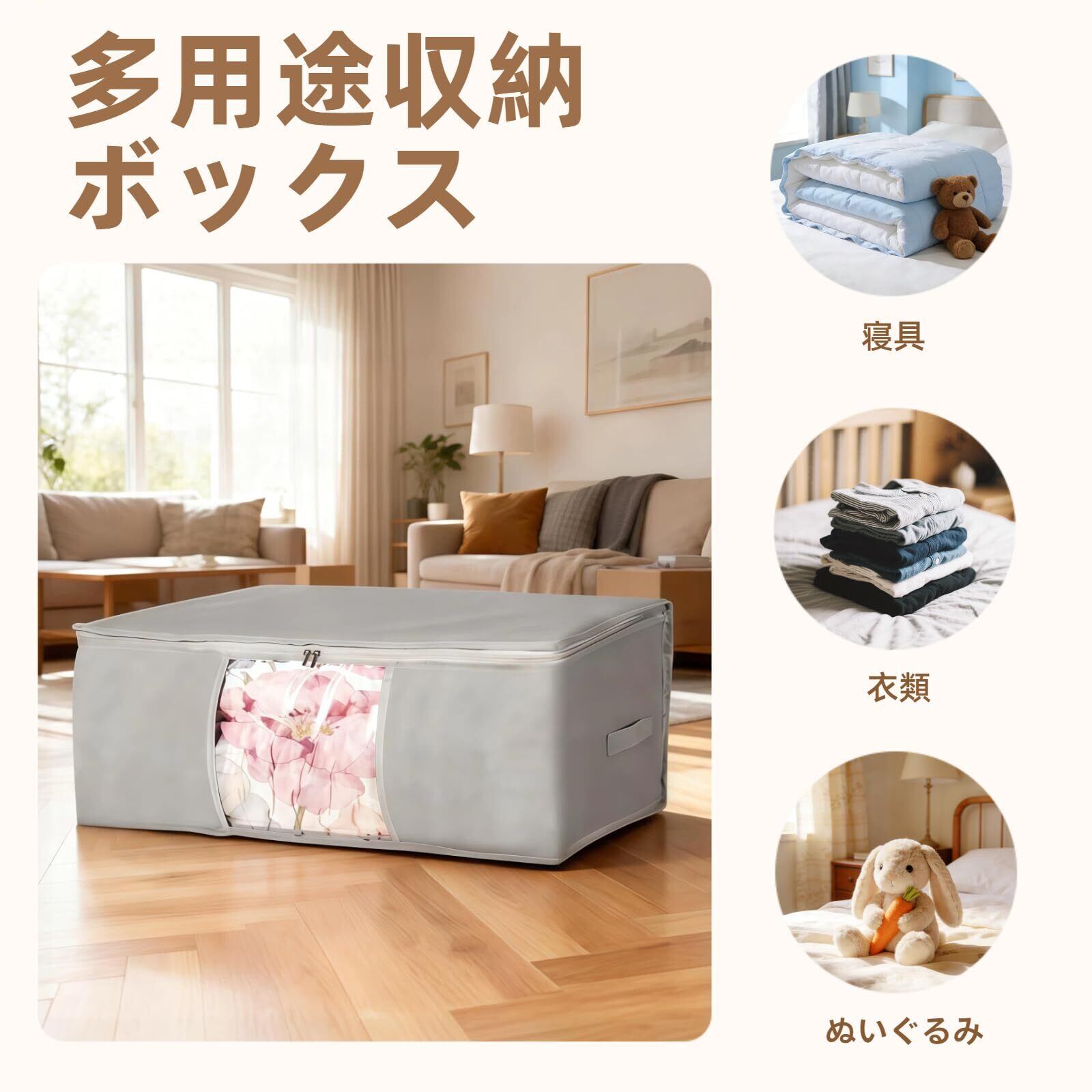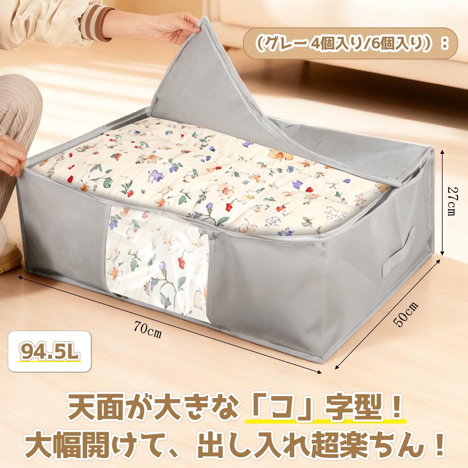 6個 布団収納 94.5L 厚手の不織布製 通気性 透明窓付き 大容量 衣類収納ケース 羽毛 布団あっしゆく袋 持ち手付き 防塵 折りたたみ式 シングル ダブル 毛布 ぬいぐるみ お昼寝 旅行カバン 大開口 軽圧縮 70cm×50cm×27cm グレー