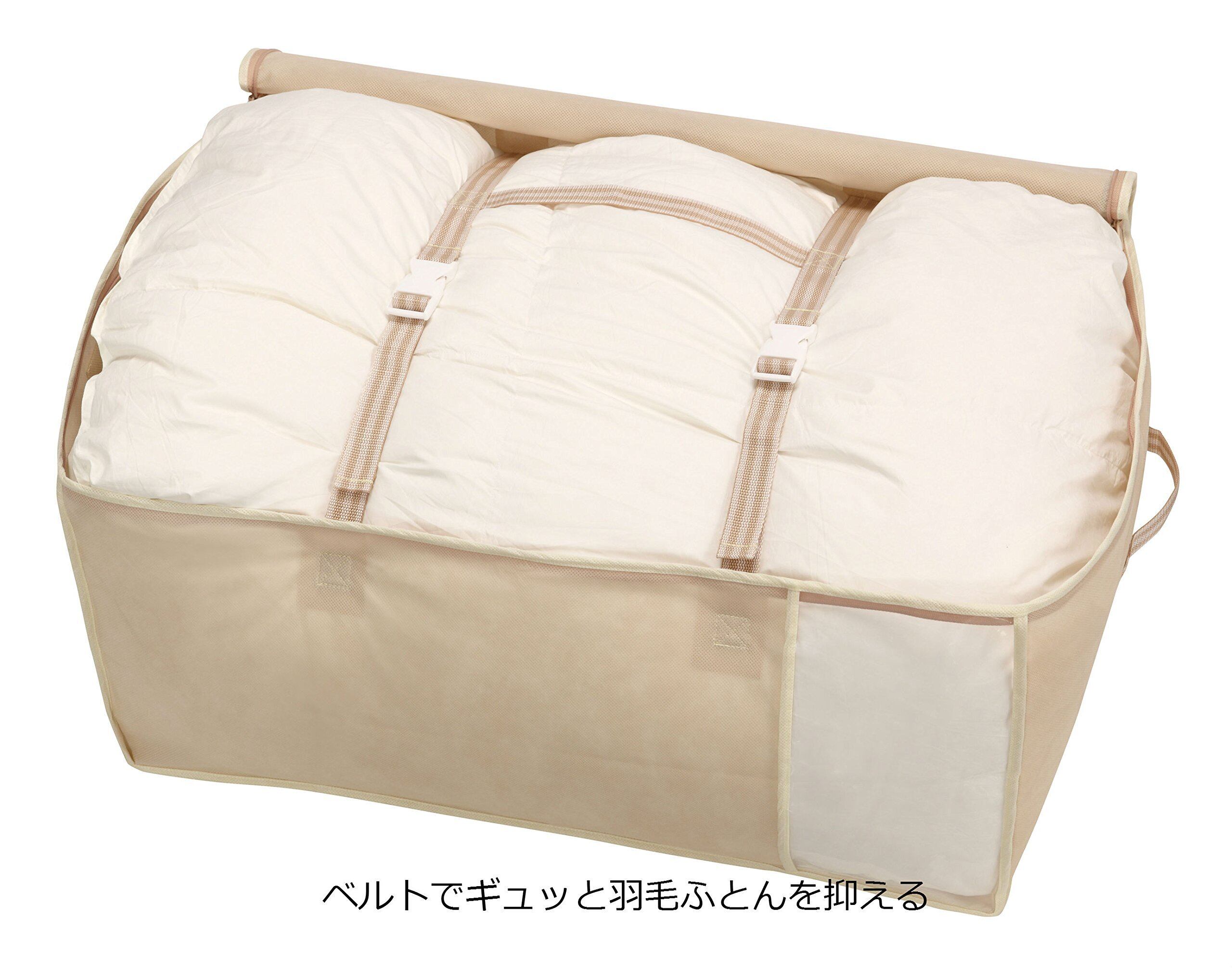 ●かさを抑えるベルト付きで、かさばる羽毛ふとんもスッキリ収納できる
