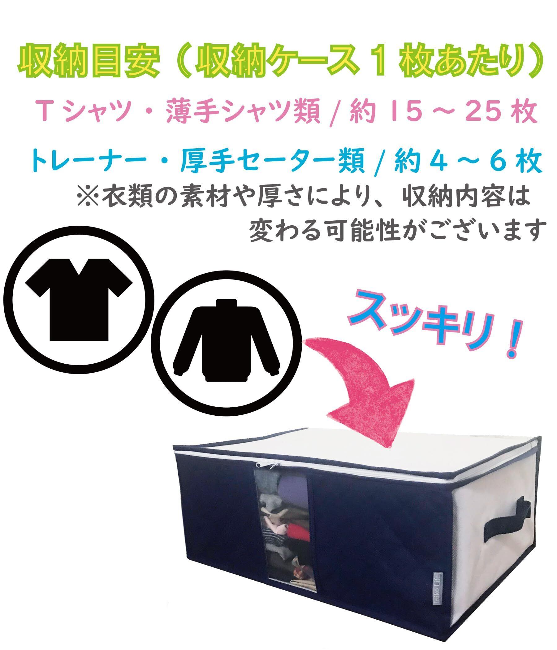 収納目安(ケース1枚あたり):布団ケース/掛け布団(シングル)/敷布団(シングル~シングルロング)各1枚 衣類ケース/Tシャツ/薄手シャツ類 約15-25枚トレーナー/厚手セーター類 約4-6枚 ※収納する物の厚みなどにより収納量は変わる可能性がございます。