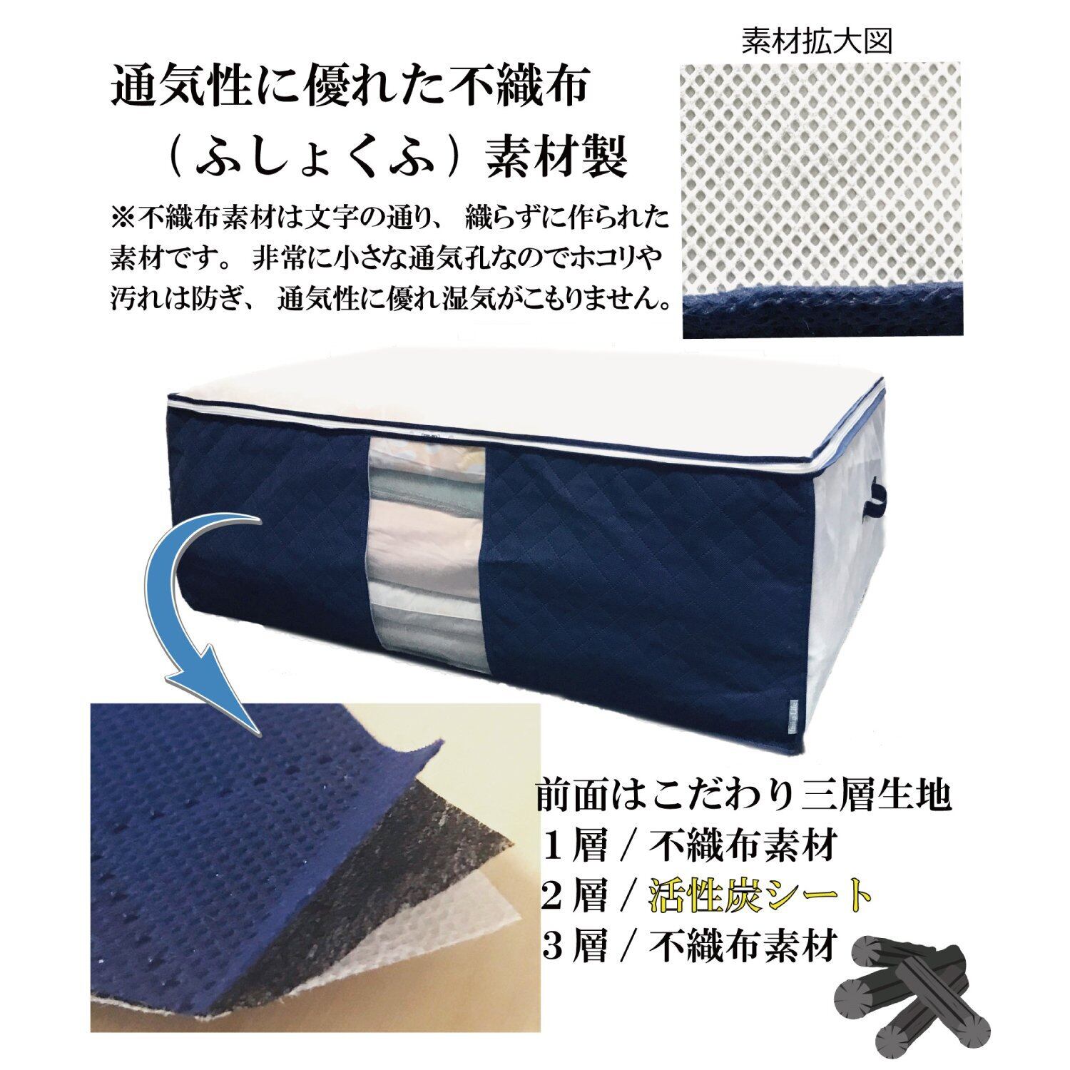 【通気性の良い布団/衣類収納ケース】通気性の良い厚手不織布製。前面に活性炭シートを加工し、大切な布団や寝具、衣類や小物などをにおい・ホコリ・汚れから守ります