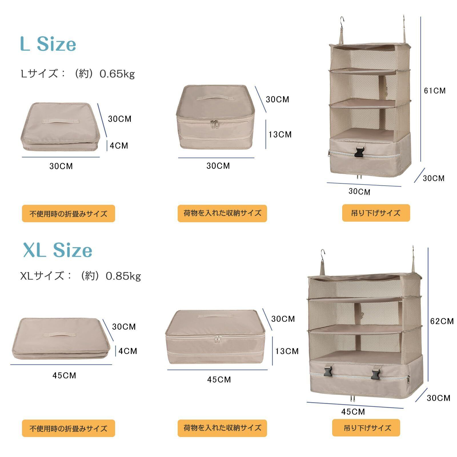 【素材】ポリエステル 【カラー】ブラック ブルー グレー ローズ カチオングレー 【吊り下げサイズ】Lサイズ:30*30*61CM XLサイズ:45*30*62CM 【荷物を入れた収納サイズ】Lサイズ:30*30*13CM XLサイズ:45*30*13CM 【不使用時の折畳みサイズ】Lサイズ:30*30*4CM XLサイズ:45*30*4CM