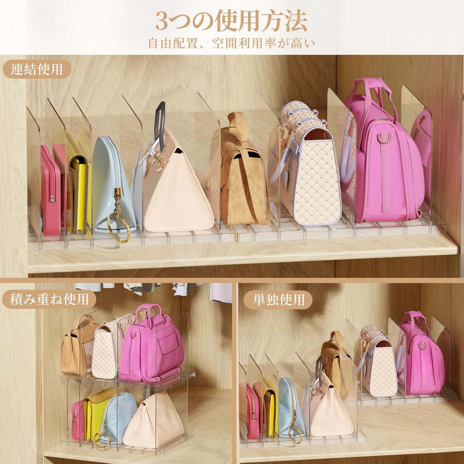 【連結・積み重ねでスペースフル活用】お部屋のレイアウトや収納ニーズに合わせて、バッグスタンドを上下に積み重ねてスペースを節約したり、横方向に複数連結して延長使用することも可能です。独立した仕切りでバッグを整理整頓し、直立収納で型崩れや押しつぶしを防ぎます。
