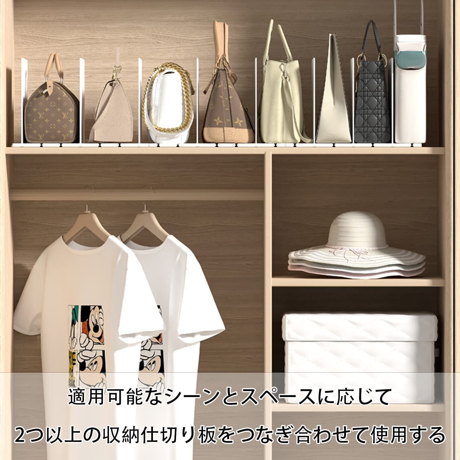 1. 【バッグを型崩れさせずに収納】 クローゼット内でバッグを立てて収納することで、型崩れを防ぎ、いつでも新品同様の状態を保ちます。仕切り板の間隔を自由に調整し、大小さまざまなバッグをスッキリと整理できます。
